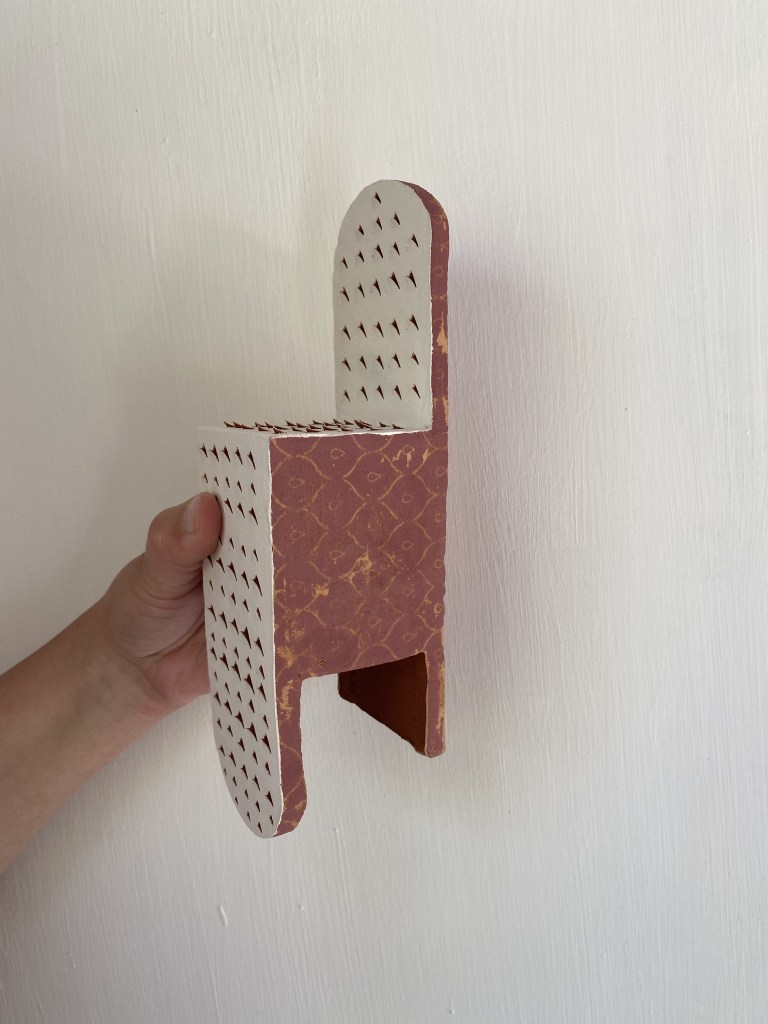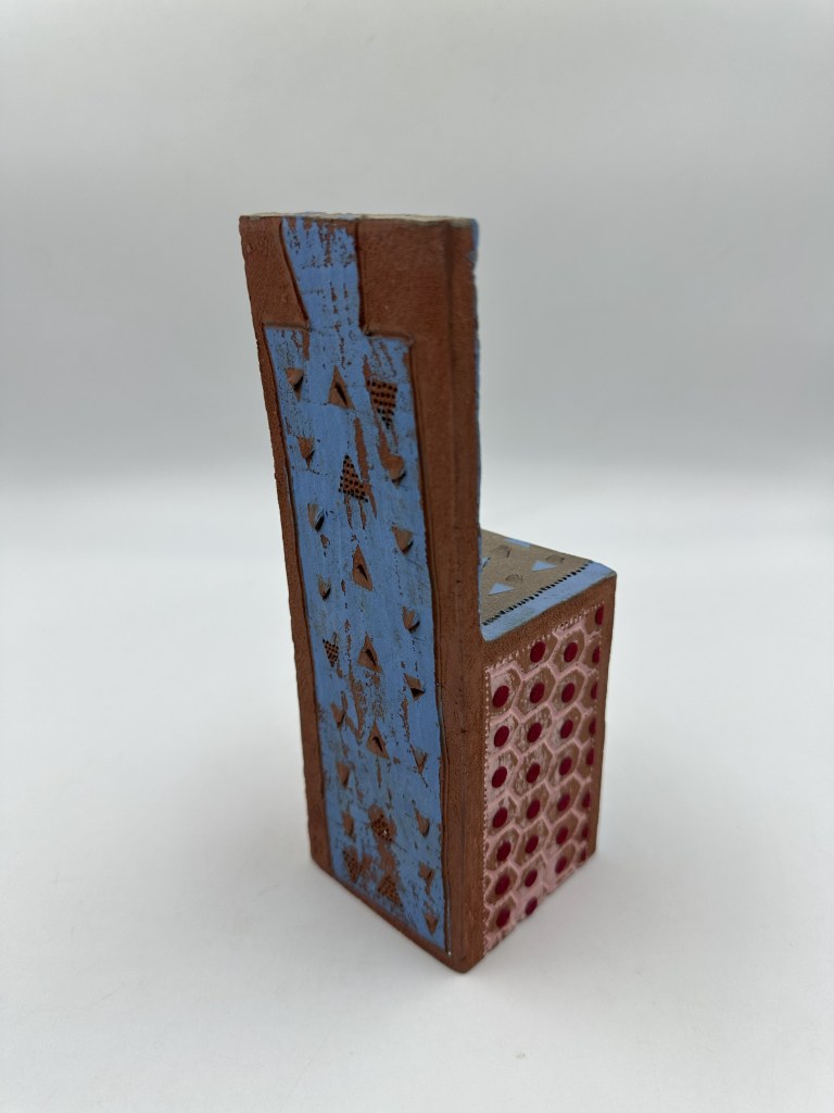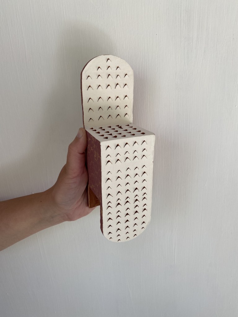 (2022) As part of the series of ceramic Chairs of Discomfort, the following chairs, which I name Chairs of Itching, are directly inspired by the cheese grater. They inspire the lines: Who will caress a sea urchin, Who will caress my skin?