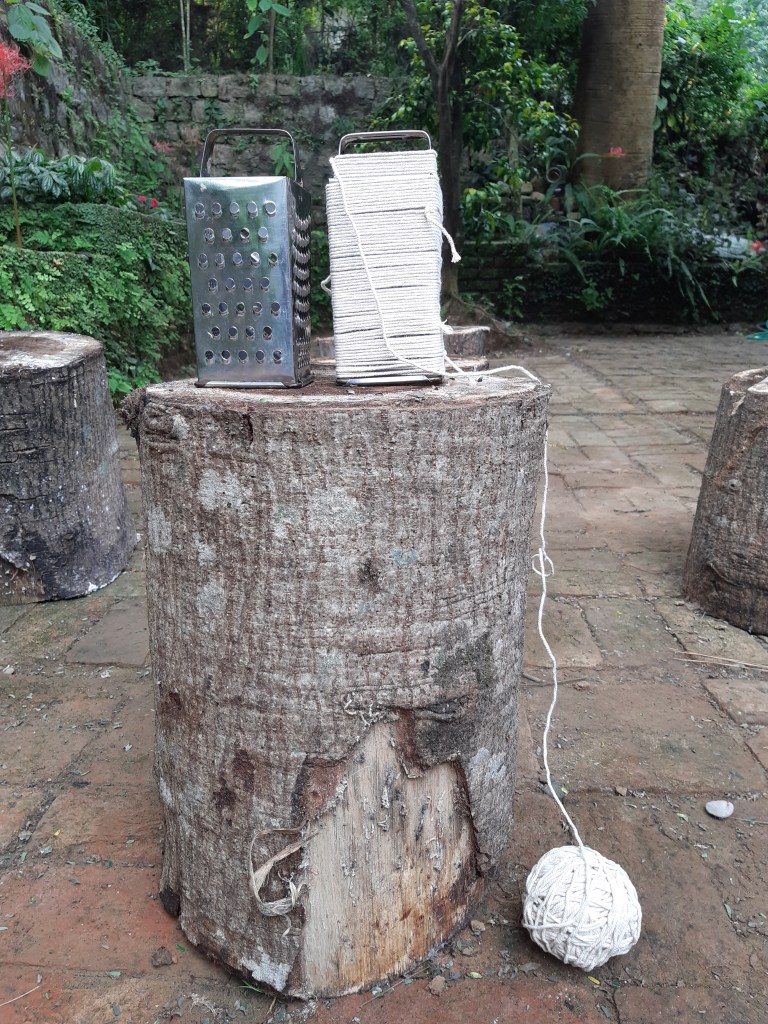 (2020) I work on making a self-portrait through found objects, in the context of Objet Trouvé+, an online residency curated by Apurva Kulkarni. The cheese grater is an obvious choice to represent my skin. I have drawn this object many times before to represent myself as skin but I am using the physical object for the first time. The ball of string used alongside is a metaphor for hiding the rough surface. I interact spontaneously with both objects and record the outcomes.