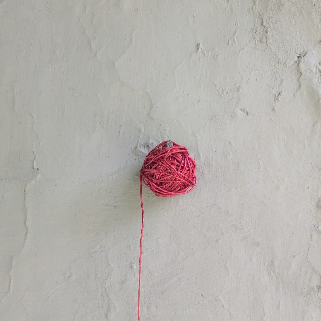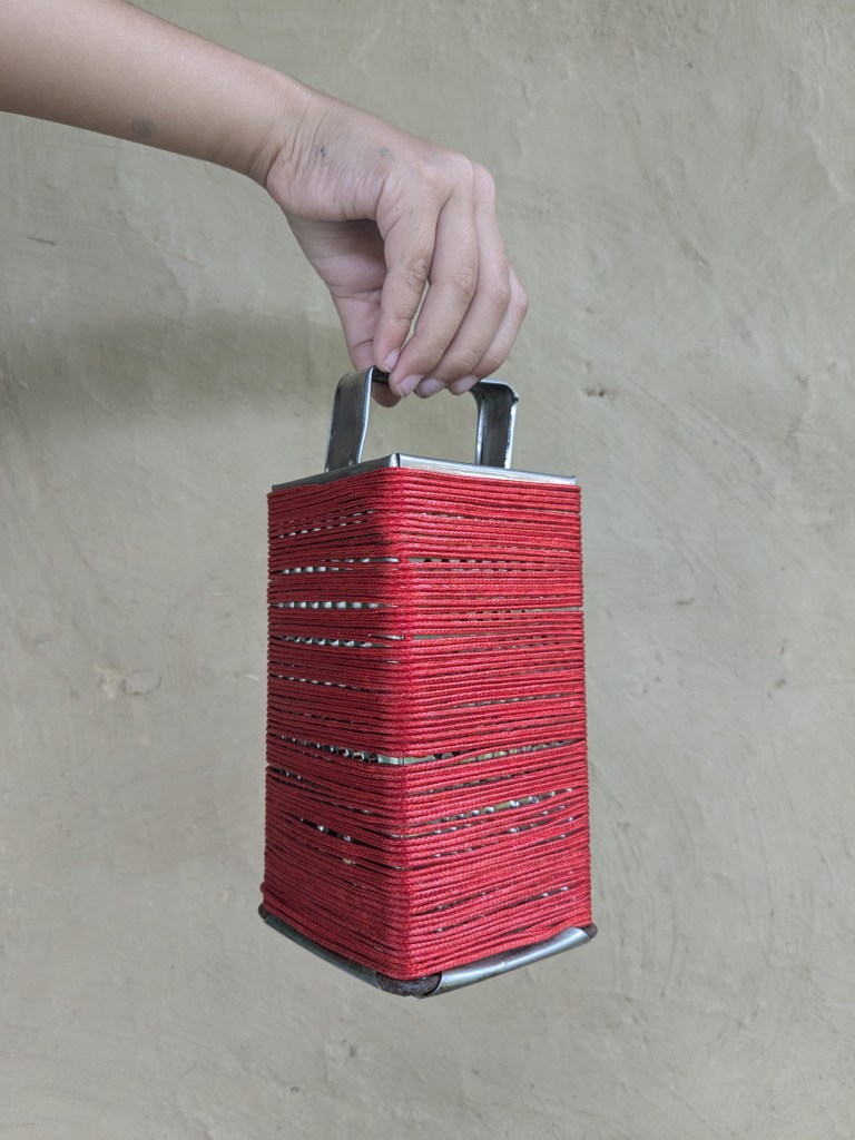 (2024) I adorn and transform the grater, document it, and undo the transformation afterwards so that the grater returns to its neutral state as functional object. This time, I use red string. It feels closer to skin. My daughter holds the object. I pass skin to her. Will she have my skin?
