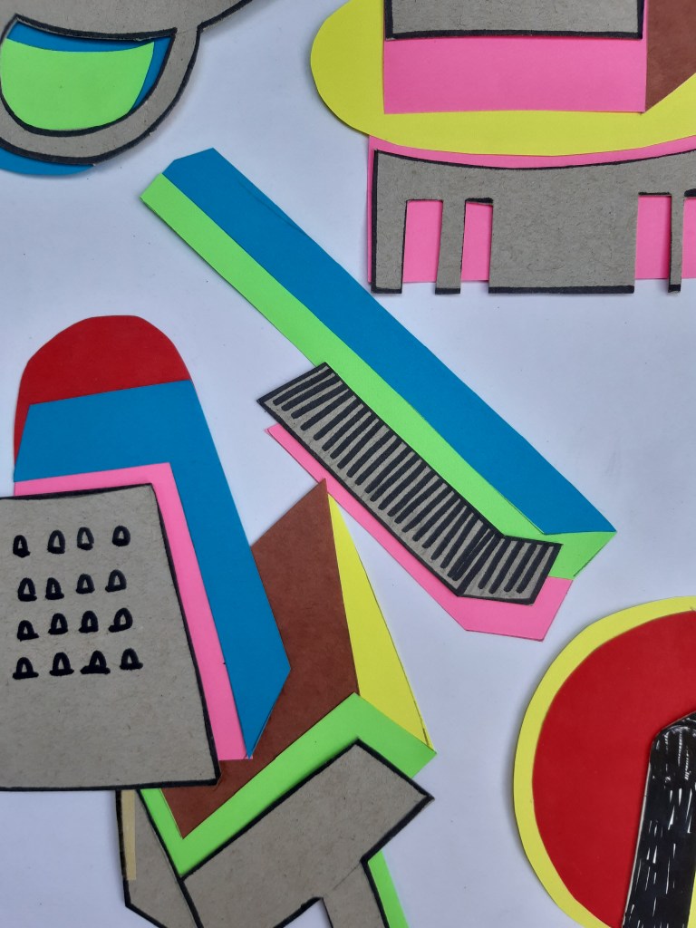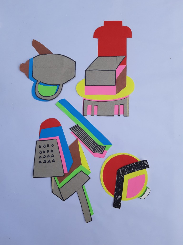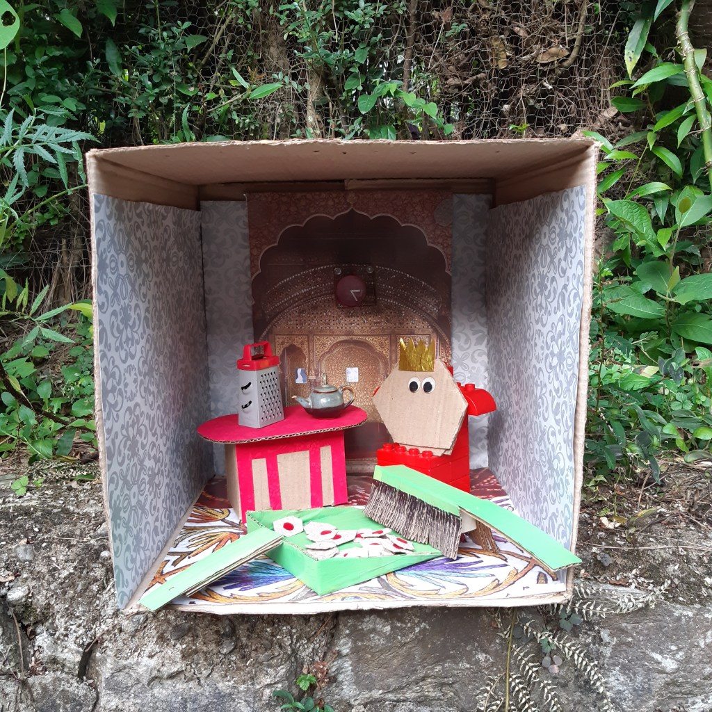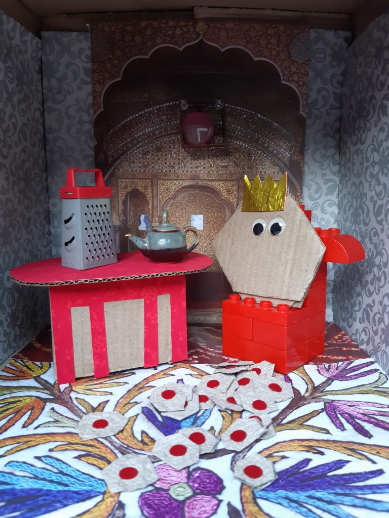 (2020) As part of the online residency Objet Trouvé+, I am prompted to create a shadow box. I personify skin and give the avatar a living space. A piece of cardboard shaped like a giant skin cell with eyes creates a character; my daughter hears King when I say Skin. The character is given a crown and the Skin King is born. The shadow box becomes his lavish living room, and incidentally a playground for my daughter.