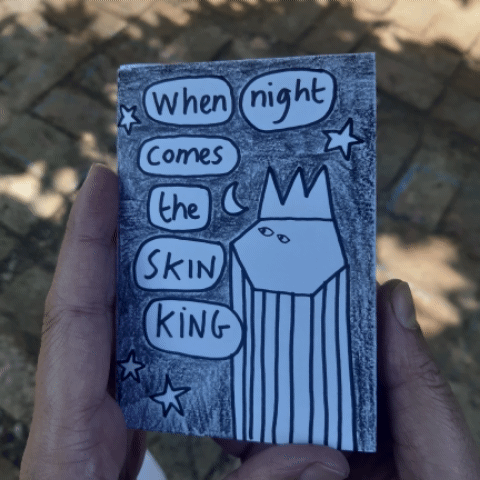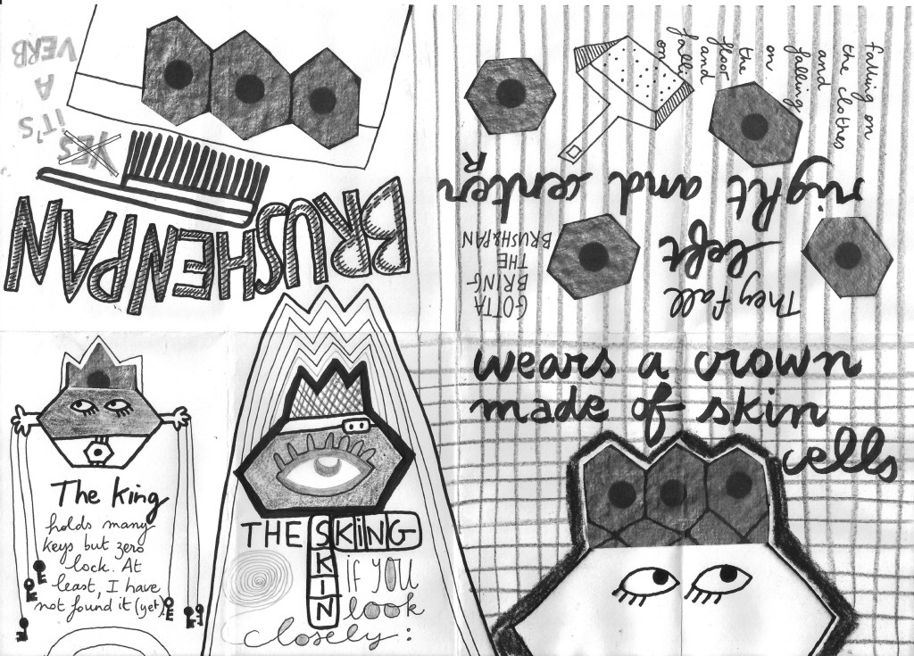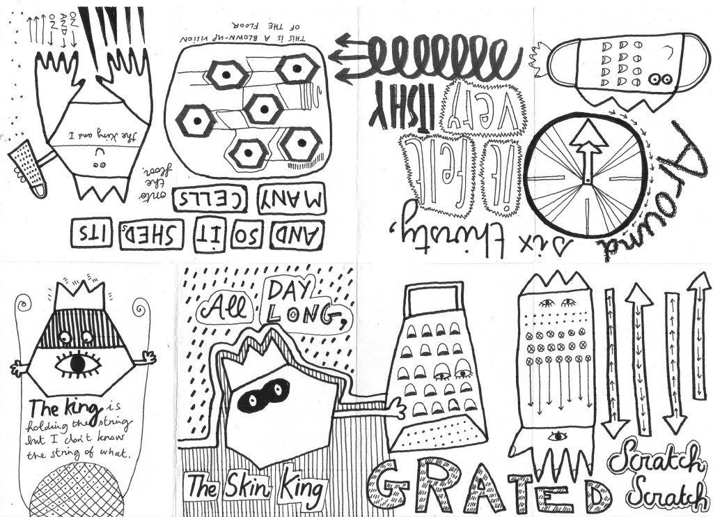 As a character, the Skin King opens up narratives and allows me to imagine stories in zines following an intuitive, stream-of-consciousness process with no pre-conceived plan or pencil. The A4 page acts as a frame; I draw on the flat open A4, beginning with page 1 and ending with page 8.
