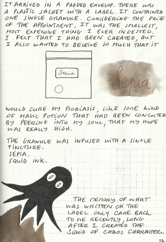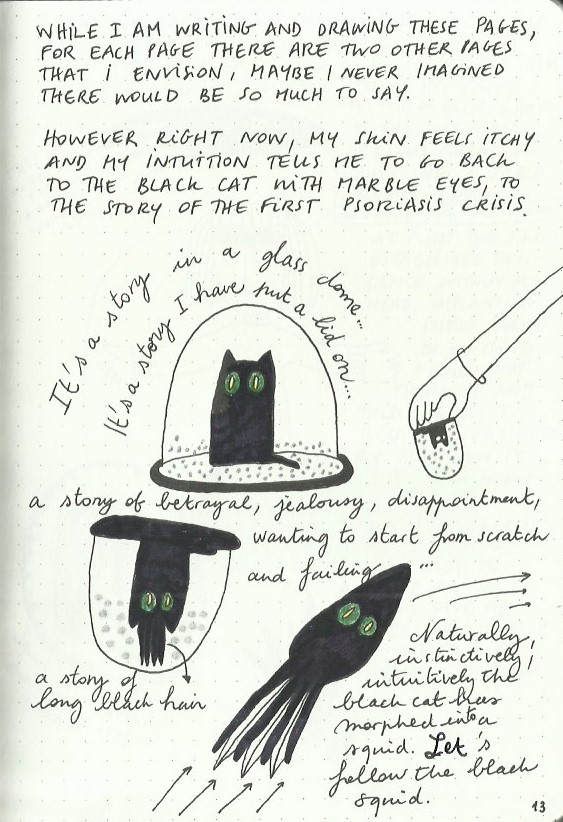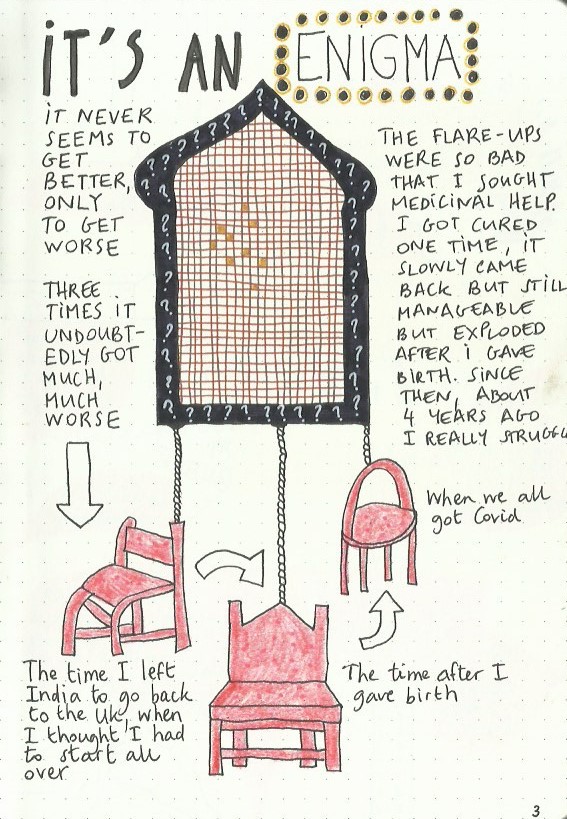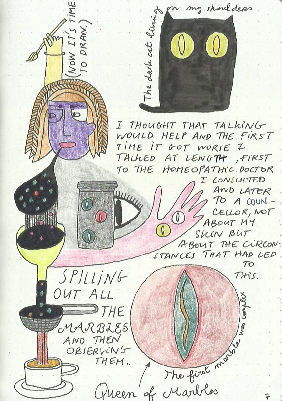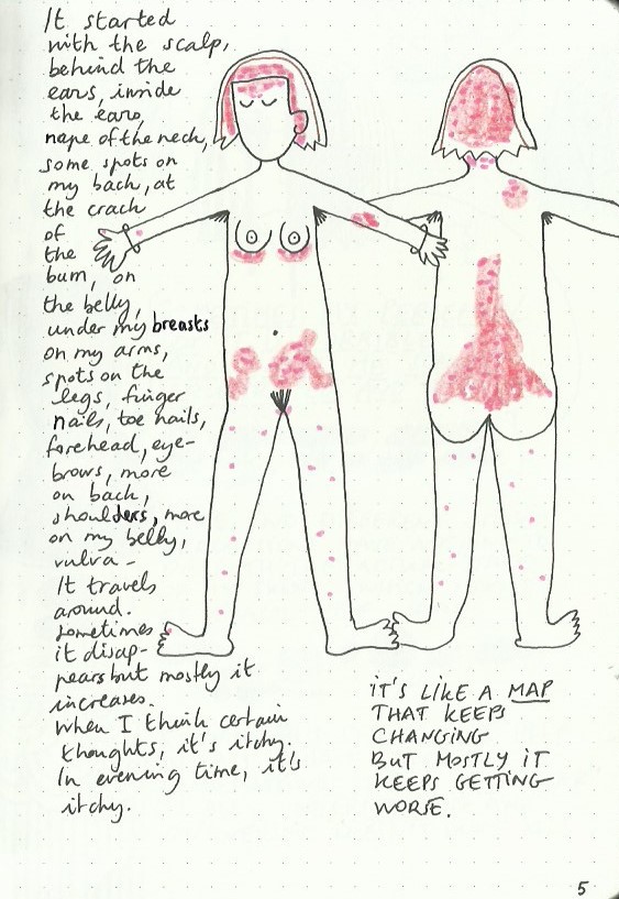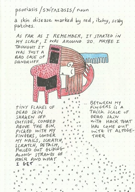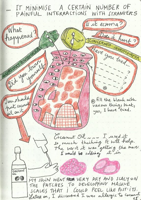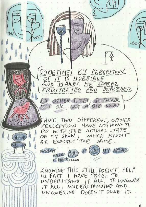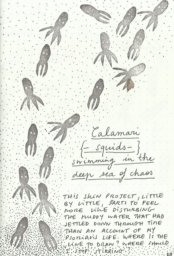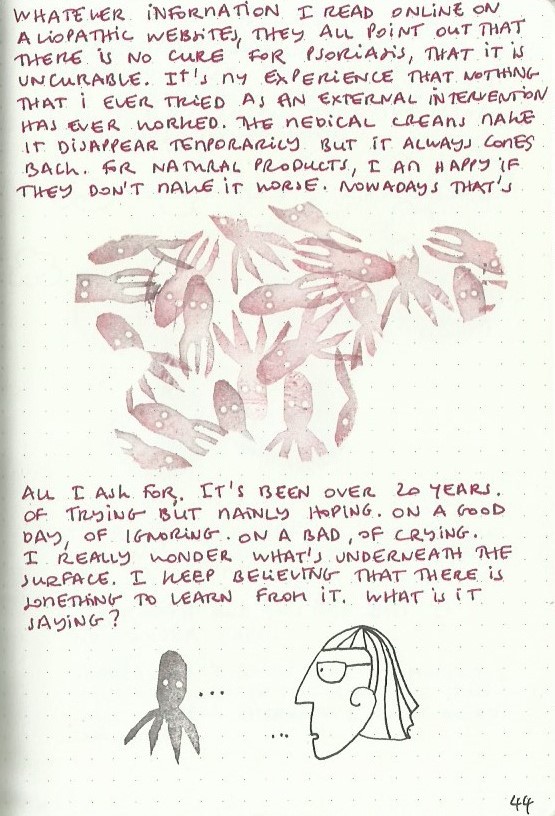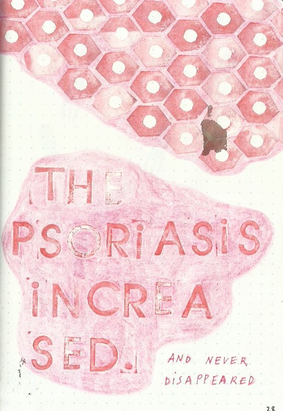 The Book of Skin is an art journal in A5 size which I started with an intent to help me deal with my psoriasis at a time when I had a major flare up. I gradually noticed my skin improving as a result of writing in it.