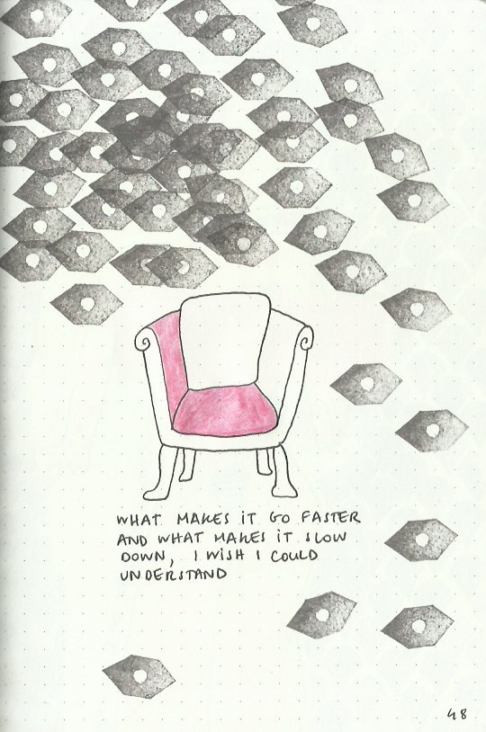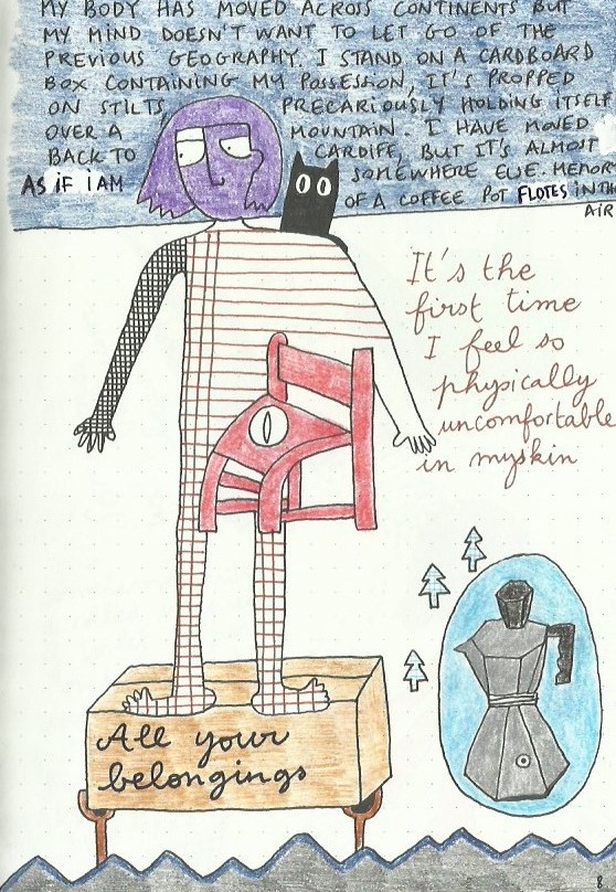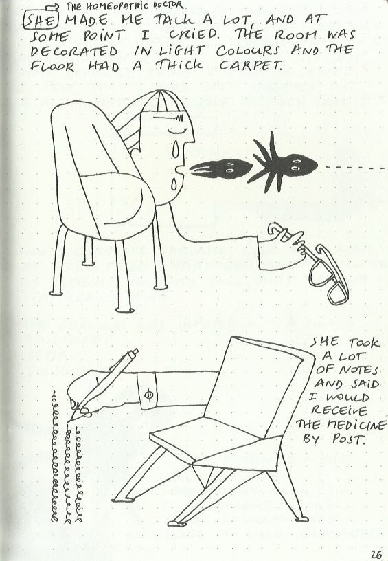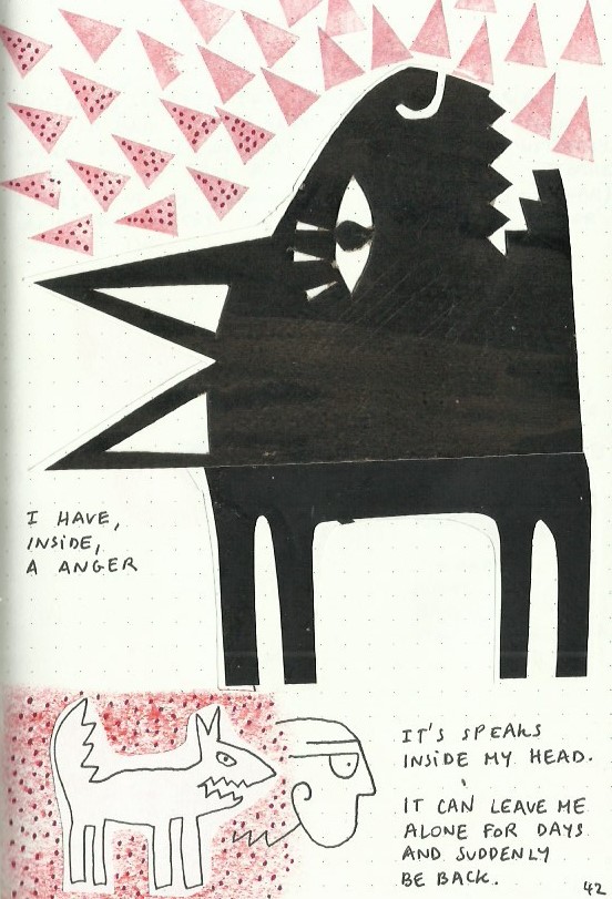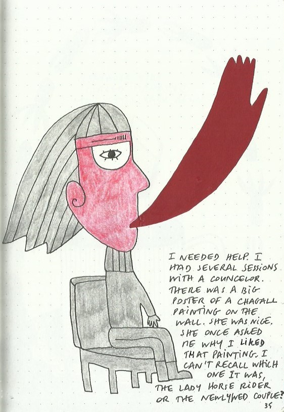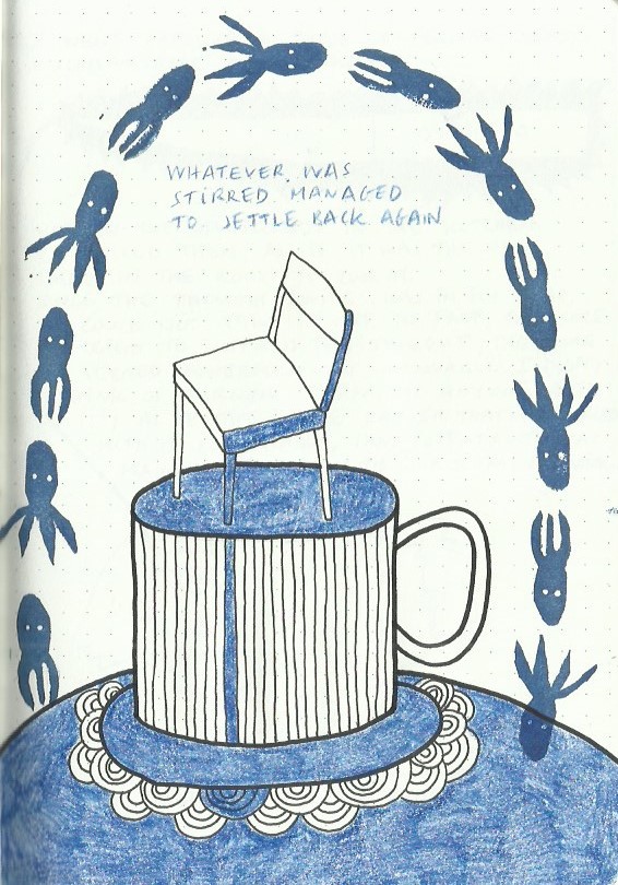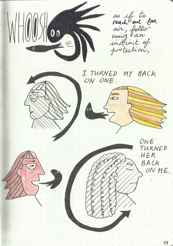 I write and draw simultaneously and spontaneously, nothing is planned and sometimes the words lead the drawings and sometimes the drawings lead the words. Often, I make discoveries and remember forgotten memories.