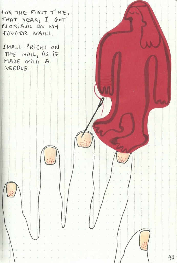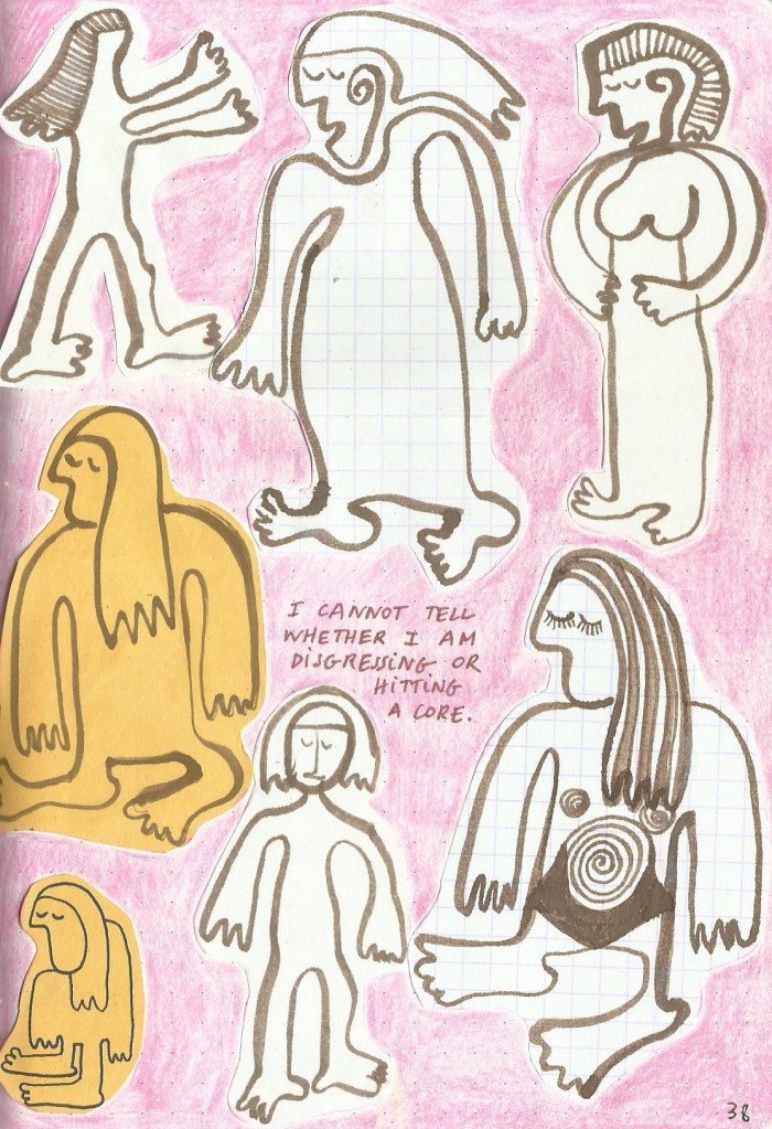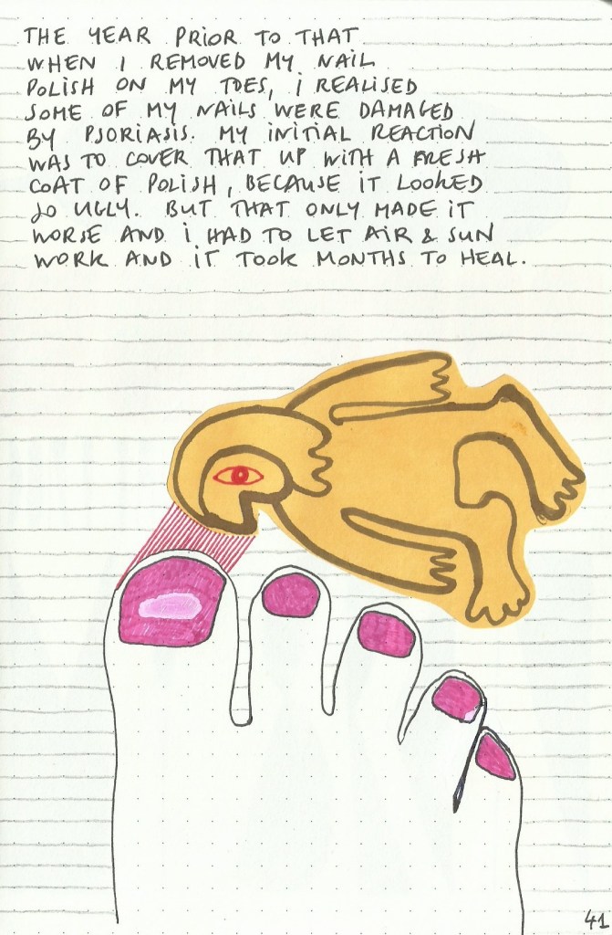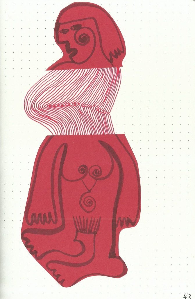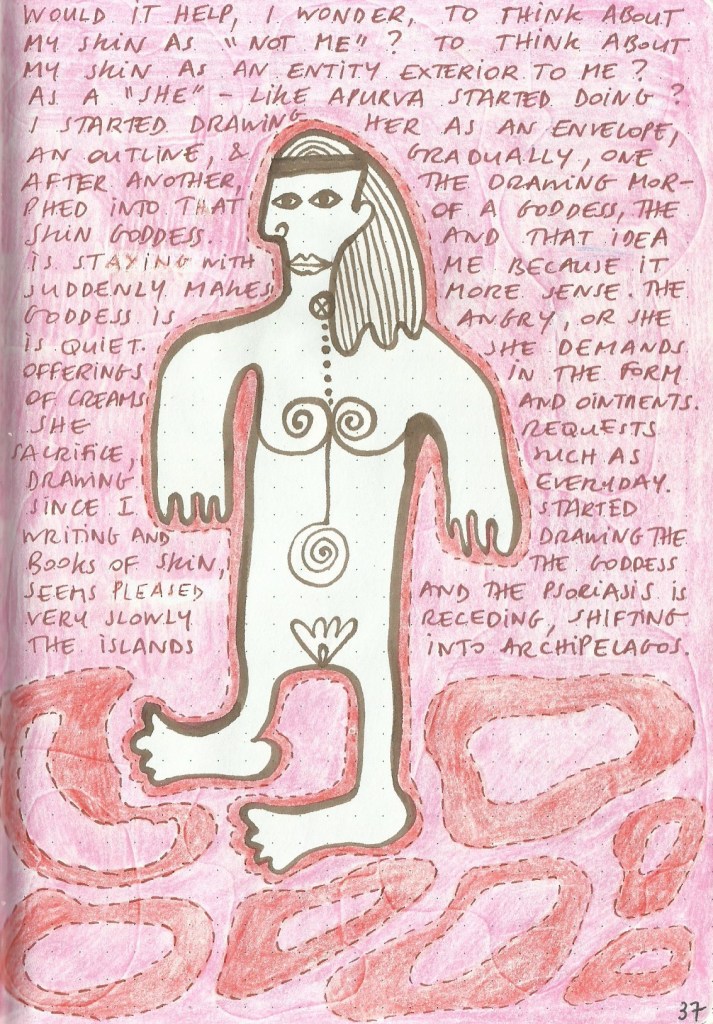 In the second half of my art journal The Book of Skin (volume 2), I follow a comment made by Apurva Kulkarni inviting me to envisage my skin as a “she”, as an external entity. I draw outlines of a personification of skin, which quickly takes the form of a “skin goddess”. This is a pivotal moment in The Skin Project, and it is also an important step in the healing process. I write: “I feel compelled to continue with the story, while knowing that the skin goddess has opened up a space”.