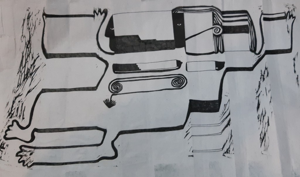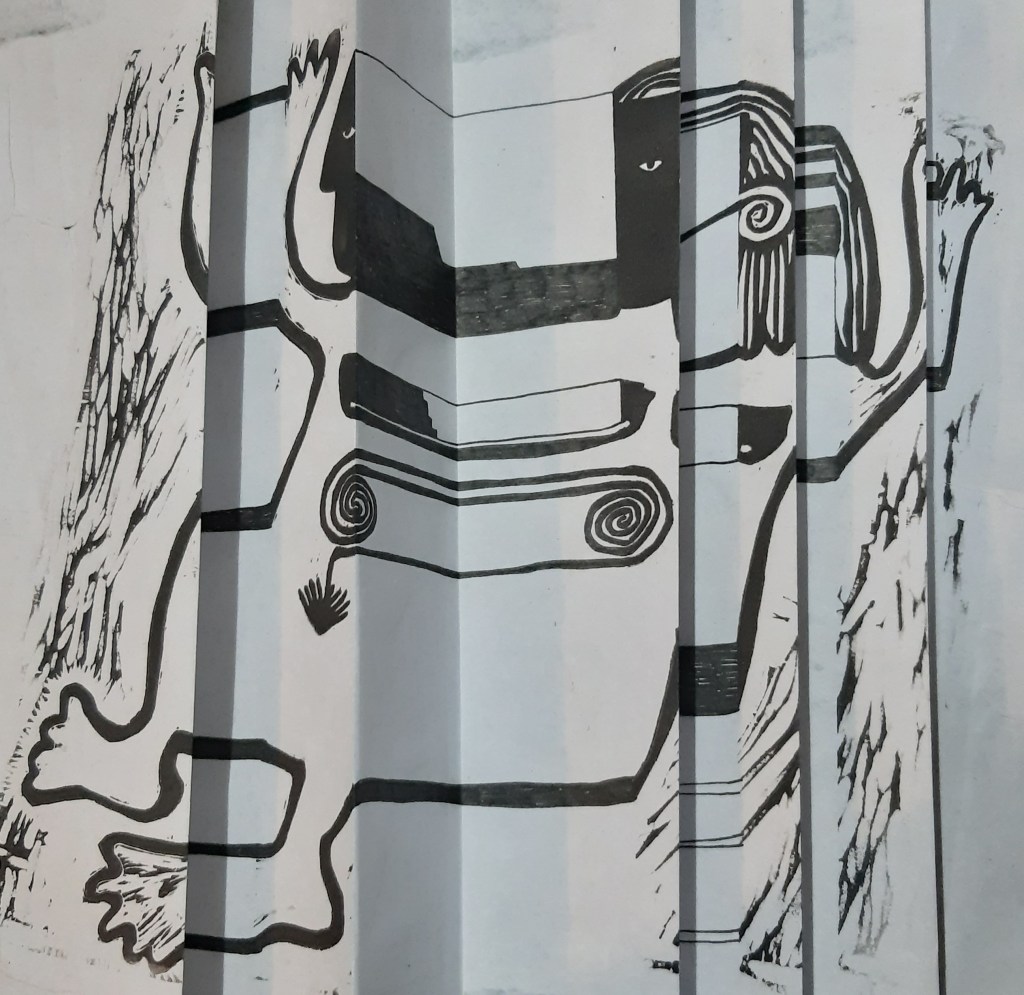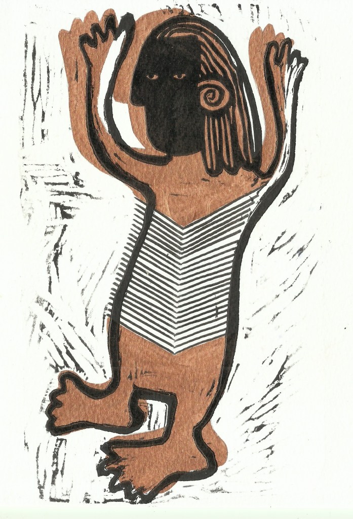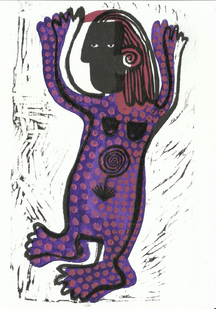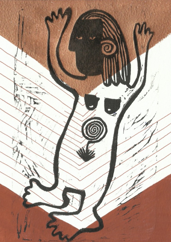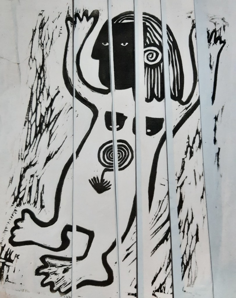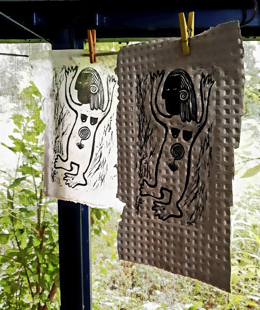 I get this image carved onto a lino block and experiment with printing on different backgrounds and types of paper. The process is new, playful and exciting; it is liberating and full of possibilities.