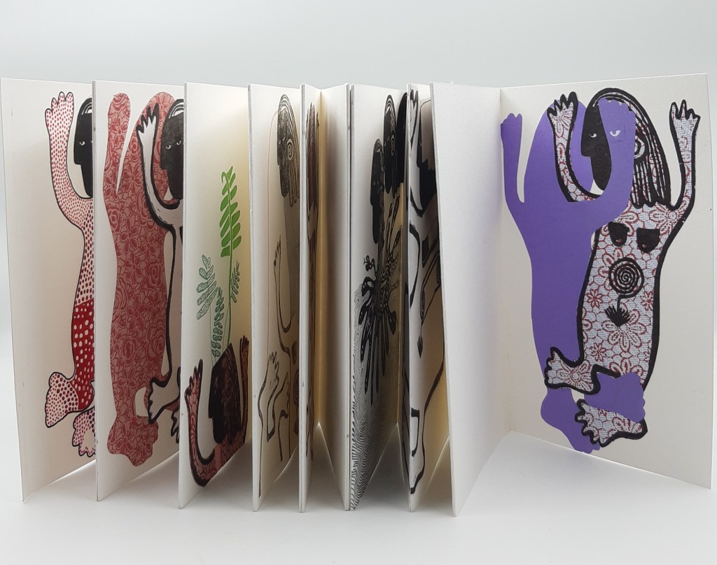 In opposition to the art journal The Book of Skin, with the printing of the goddess, language becomes silent. I cut the prints to create collages mixed with drawings and I join the pages in a concertina book. It has no cover, no beginning and no end; I leave the possibility open to add pages later. These images without language look like mythological elements, a mythology not yet narrated. It’s important, I feel, that this Concertina for a Goddess remains free of words.