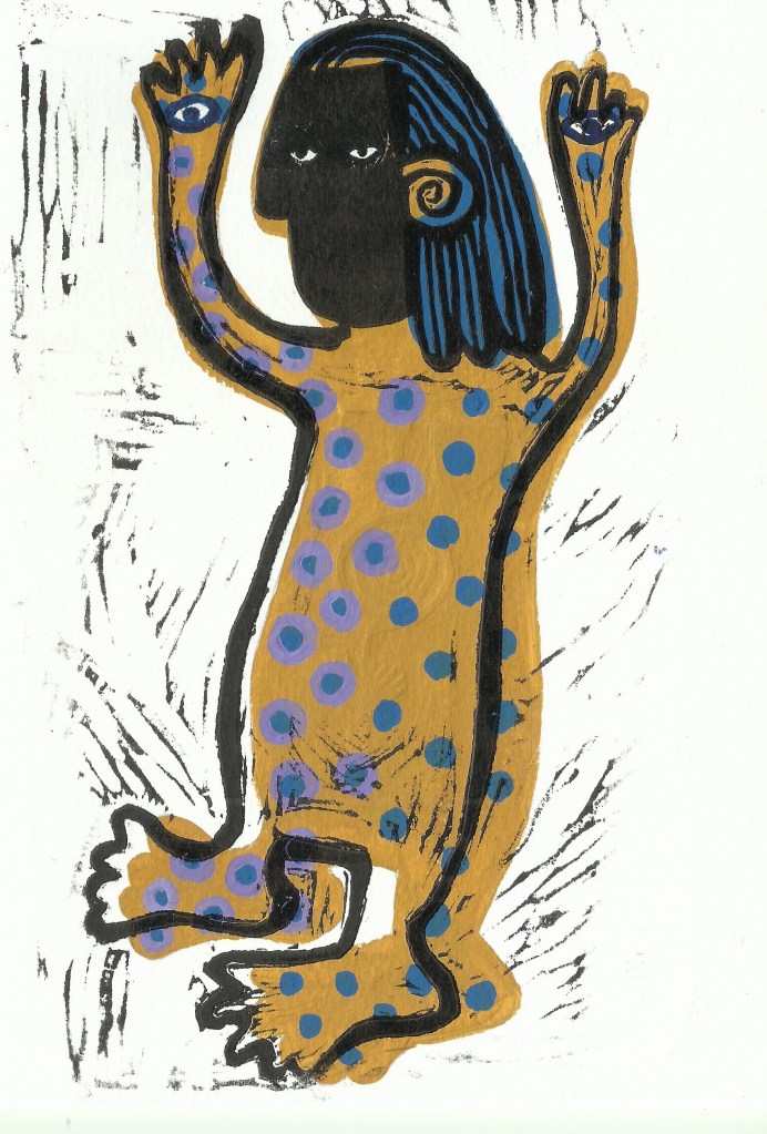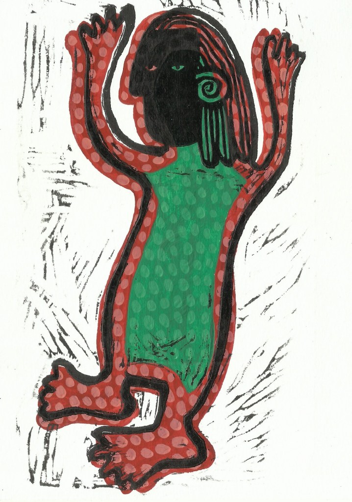 (2022) I start a series of lino prints on original artworks that I name Dresses for Olop. The name Olop comes from Our Lady of Psoriasis, another name I give to the Skin Goddess and which I coined while working on this particular series.