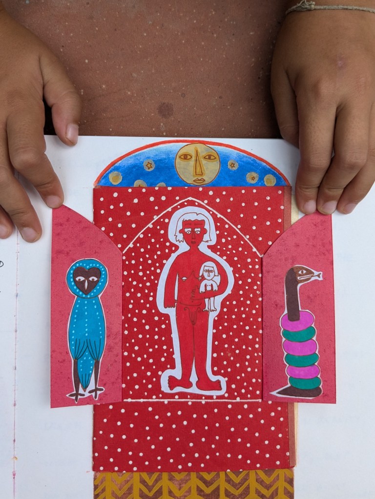 (2023) In my art journal Our Lady of Psoriasis, I created a two-dimensional kawad-style shrine that tells a wordless story of the night I gave birth. So far, a wordless rendition has been the only way I have been able to express myself. The shrine includes representations of transgenerational elements.