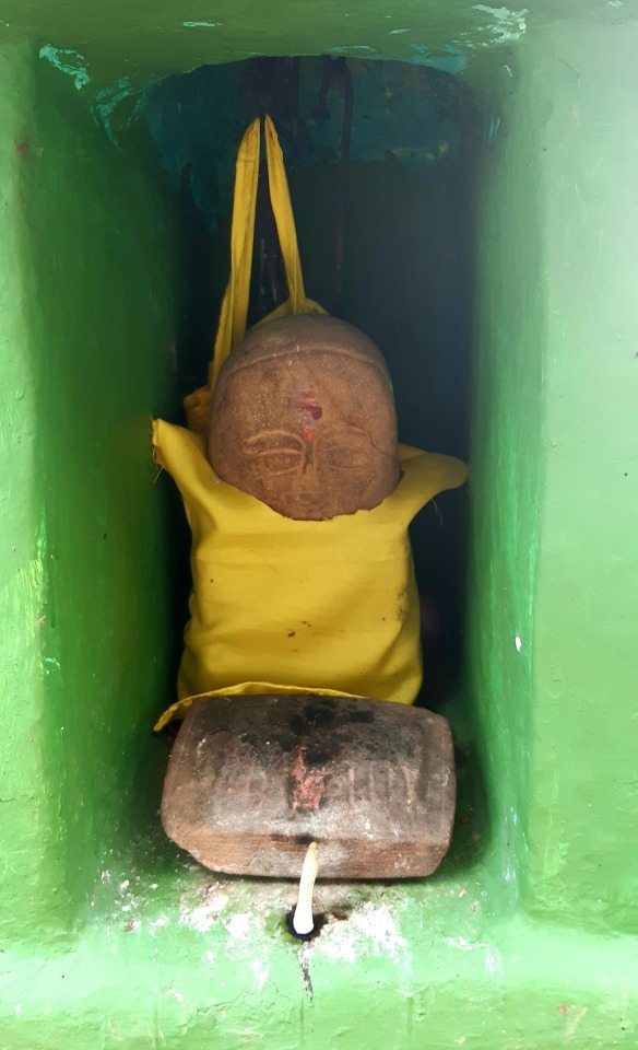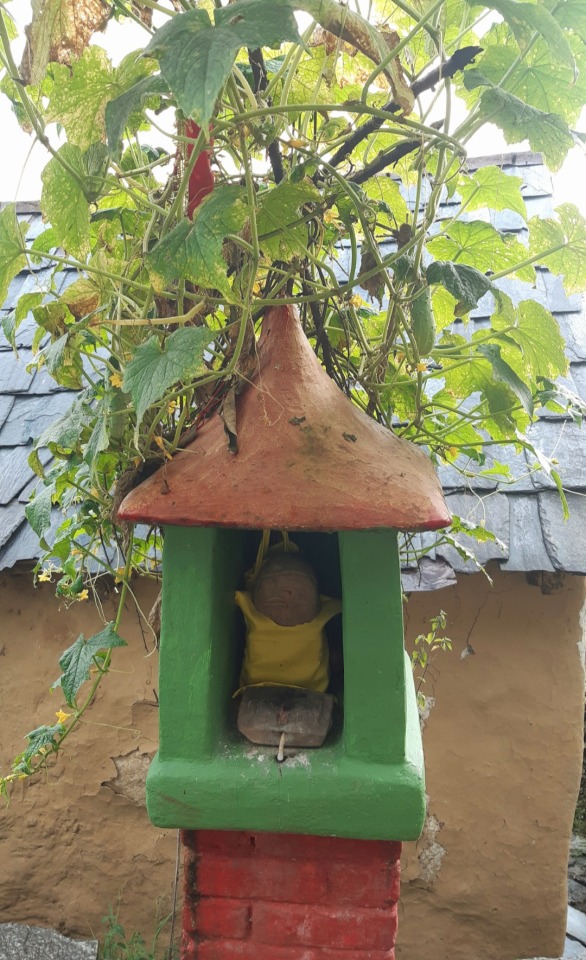 I document local house temples found in private courtyards of Himachali villages. They are simple little houses with walls and a roof. I see connexions visually with the shadow box of the skin king.