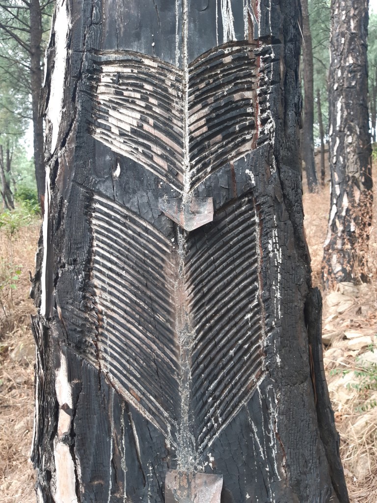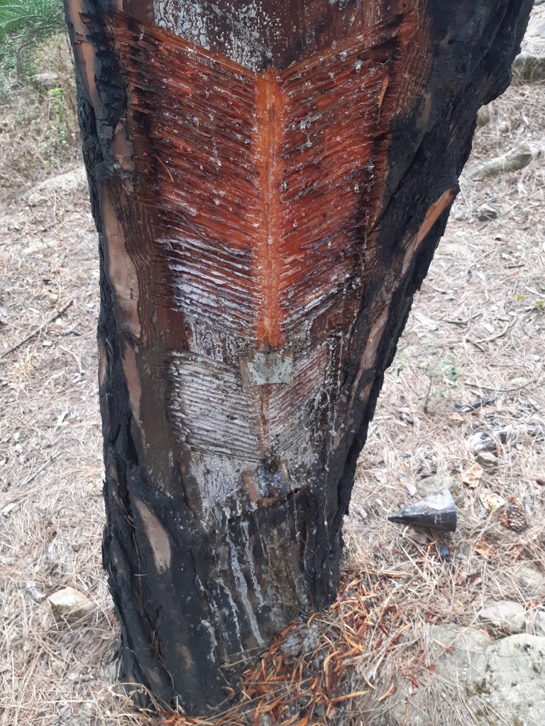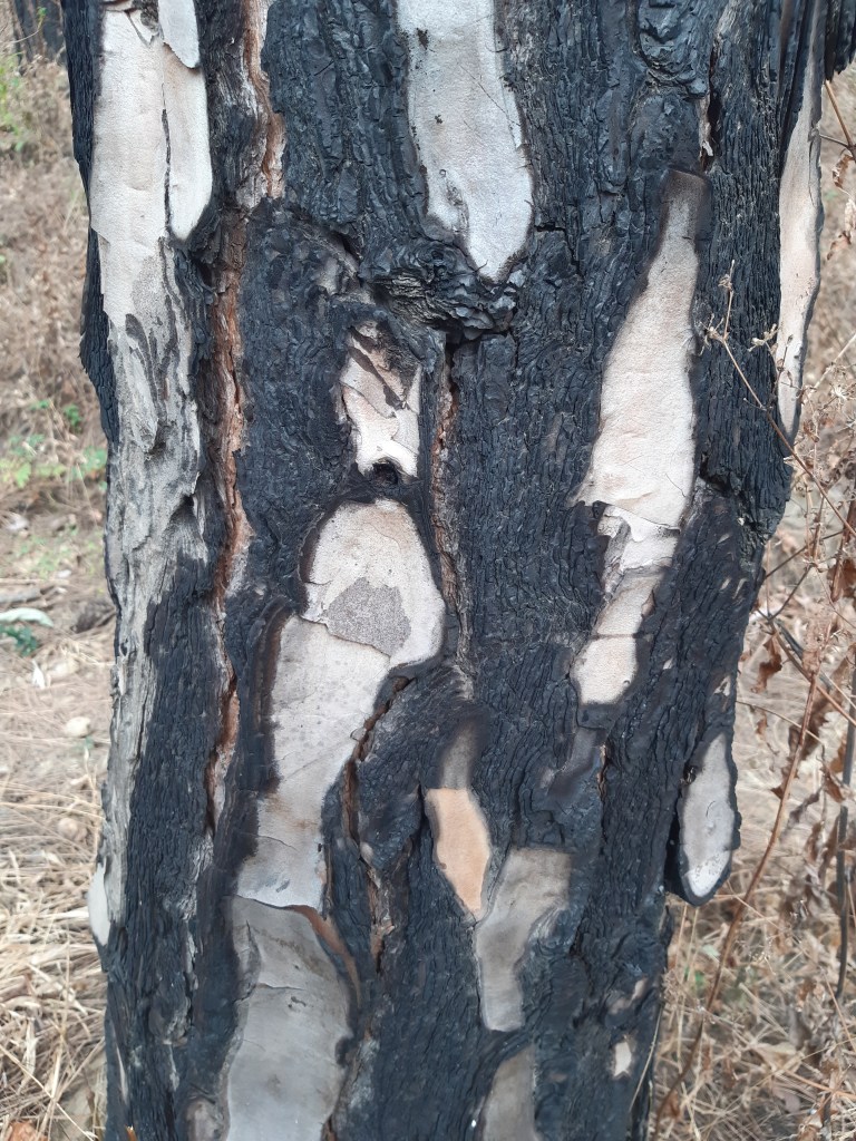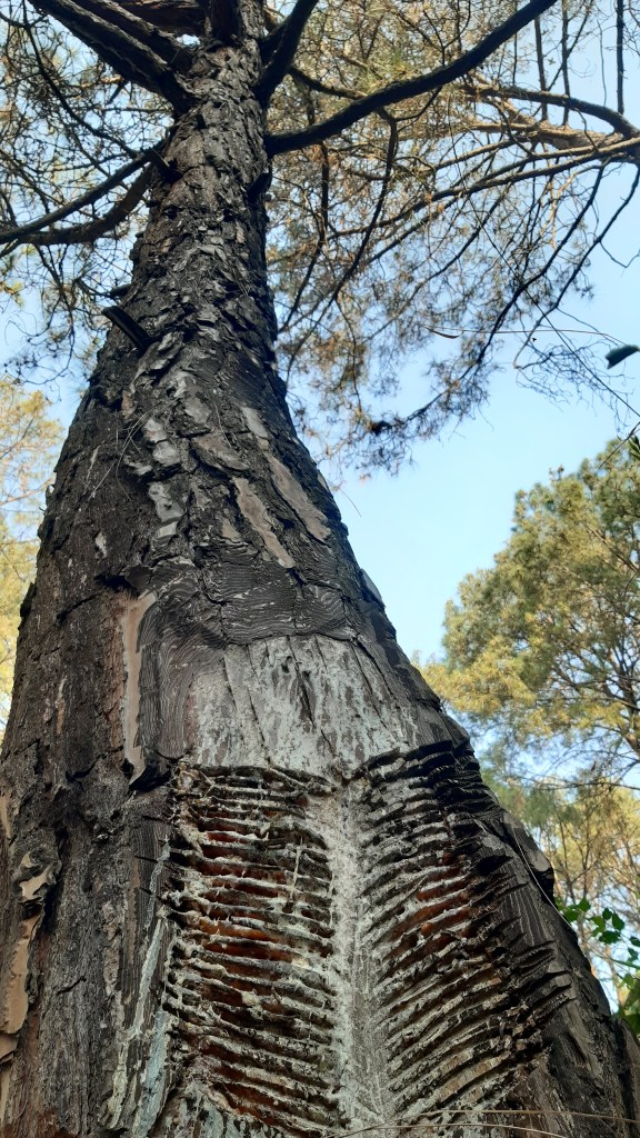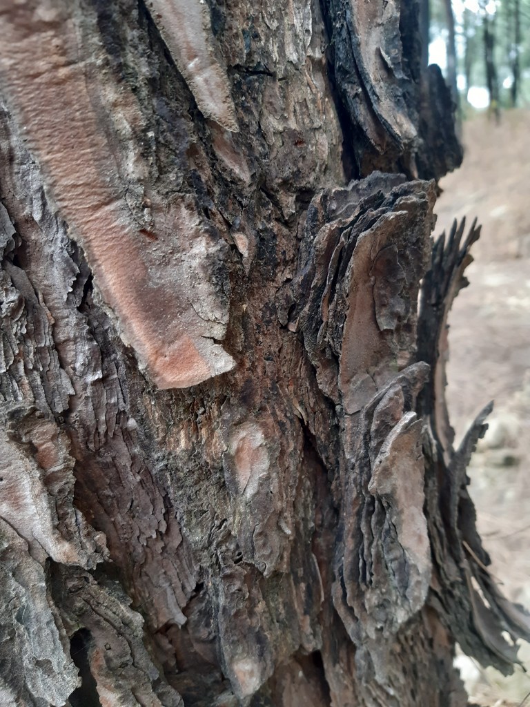 During my walks, I observe skin in the natural world. The bark of pine trees peel off like my psoriasis patches, the man-made scorings reveal flesh, and it oozes.