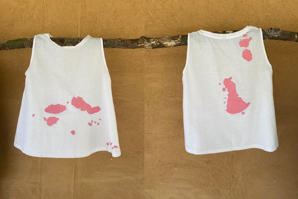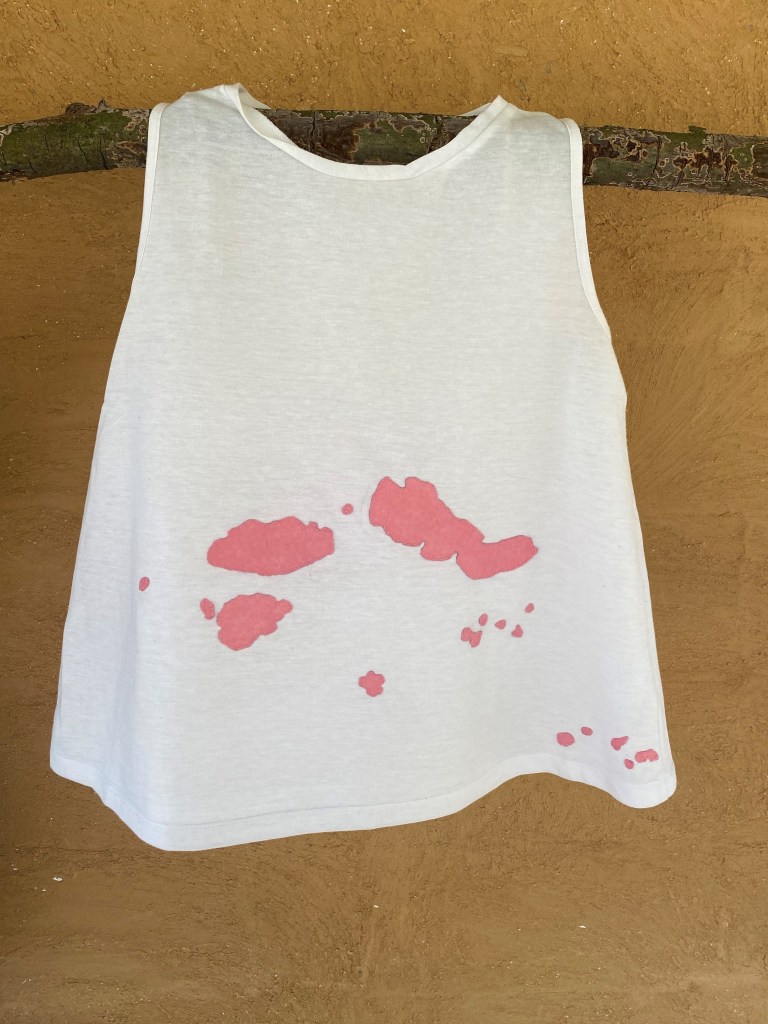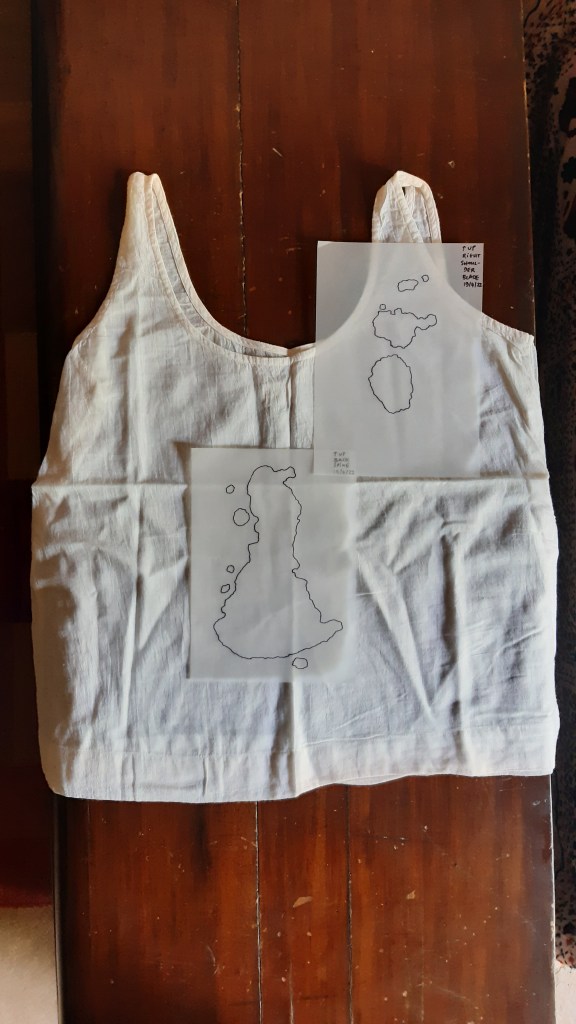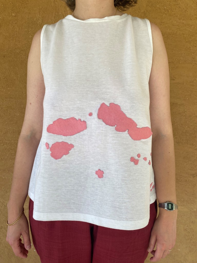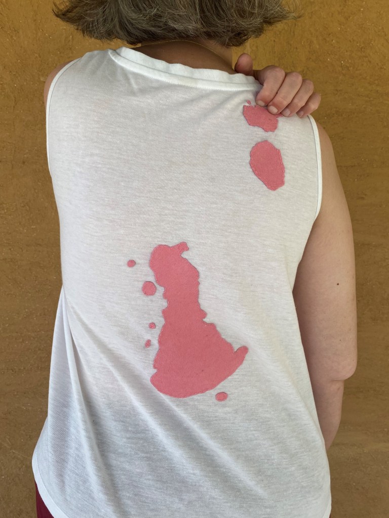 (2022) Psoriasis Surrender is the final work I submitted for the exhibition from the residency As Above So Below (2022). It uses felt appliqué on a ready-made garment to map the plaques of psoriasis on my torso and my back, exposing what I hide under my clothes. The work also acts as a record of the state of my skin at that particular point in time. The photos show me ‘wearing’ my skin as well as the ‘shed’ skin’, symbolising what I want to discard. Many times, I feel like removing my skin because the discomfort is such.