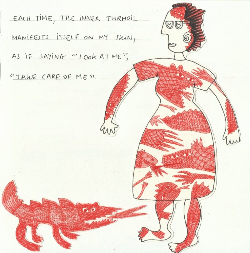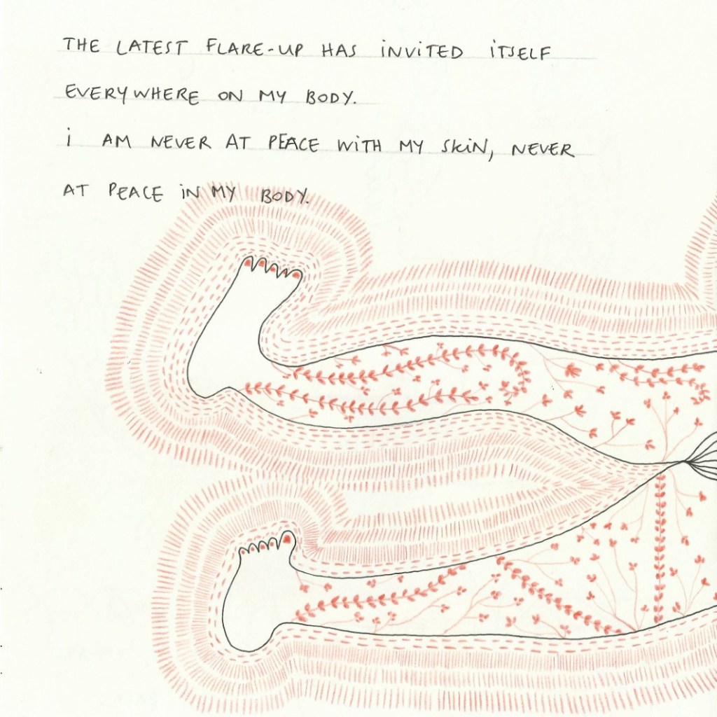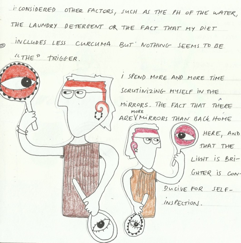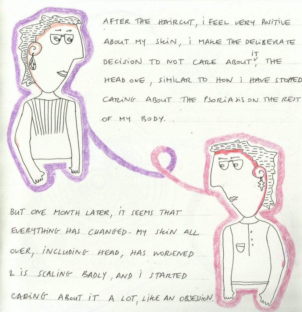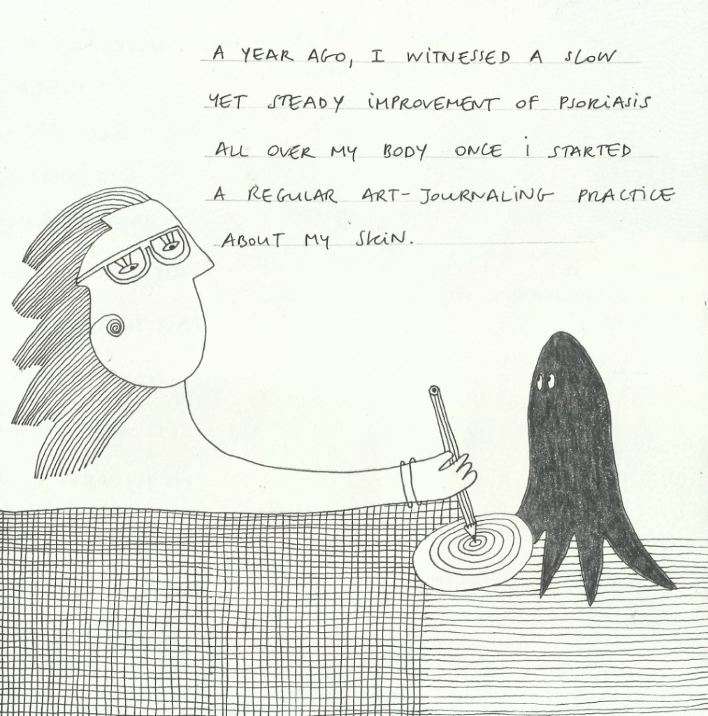 (2022) I start a graphic journal that I name Our Lady of Psoriasis, at a time of a serious flare-up after a long phase of steady improvement. This time, drawing did not seem to have an incidence on reducing the inflammation, however it was more bearable to live through it as I drew. The first pages address the feelings of psoriasis skin and the attempts to heal.