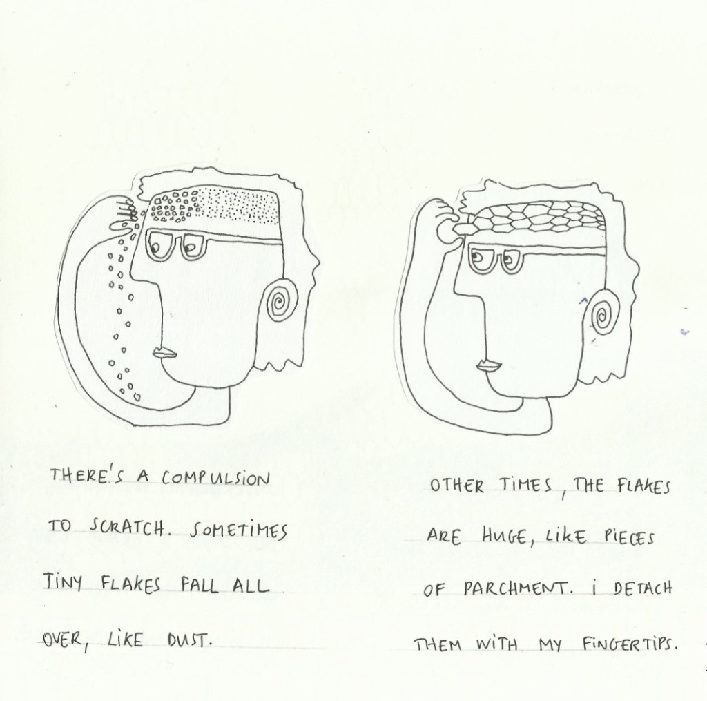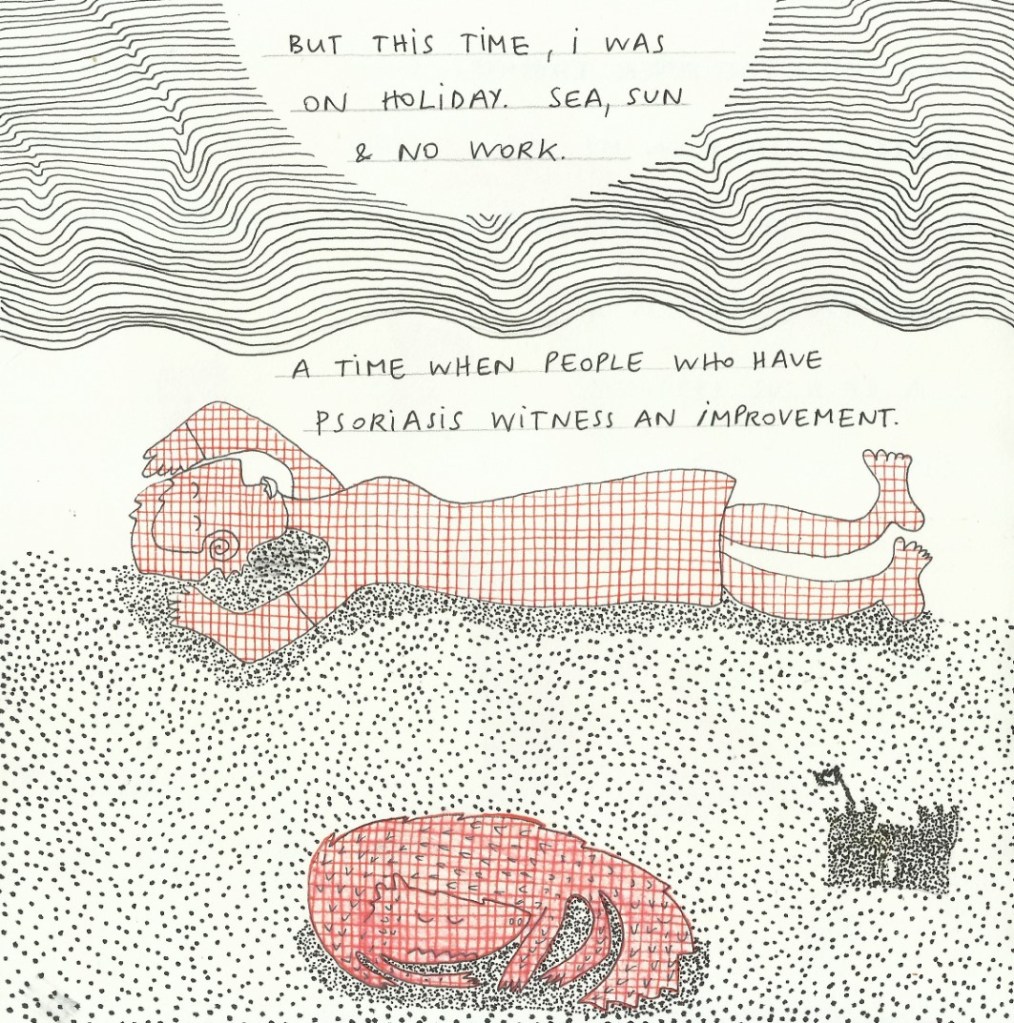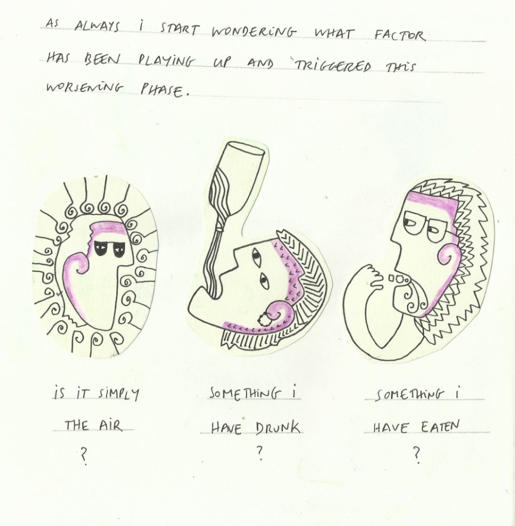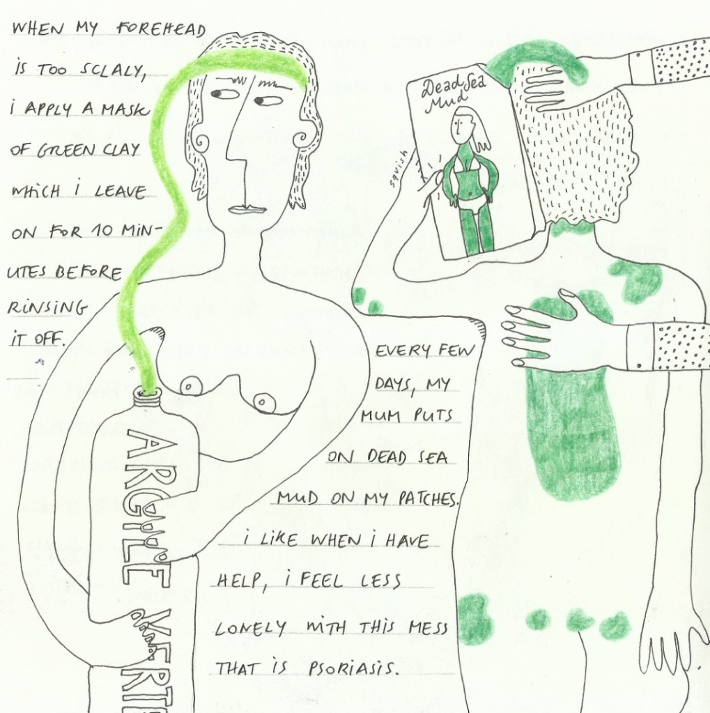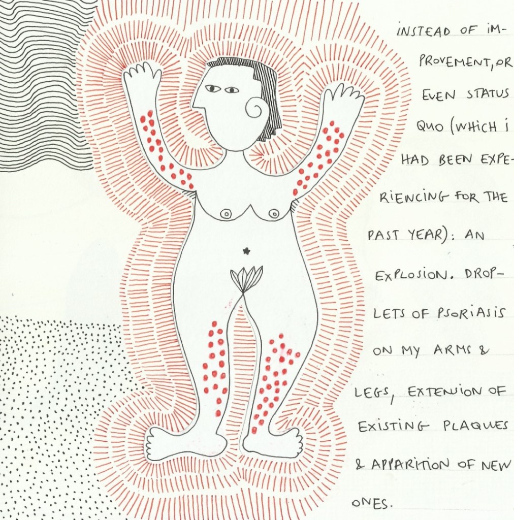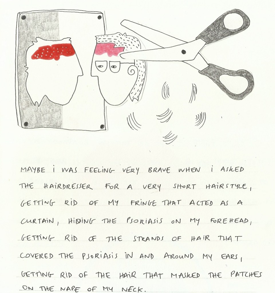 (2022) I start a graphic journal that I name Our Lady of Psoriasis, at a time of a serious flare-up after a long phase of steady improvement. This time, drawing did not seem to have an incidence on reducing the inflammation, however it was more bearable to live through it as I drew. The first pages address the feelings of psoriasis skin and the attempts to heal.