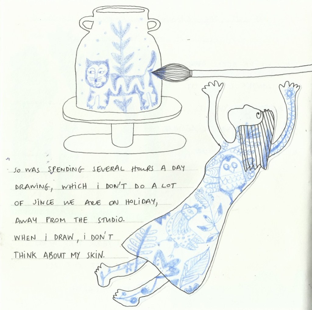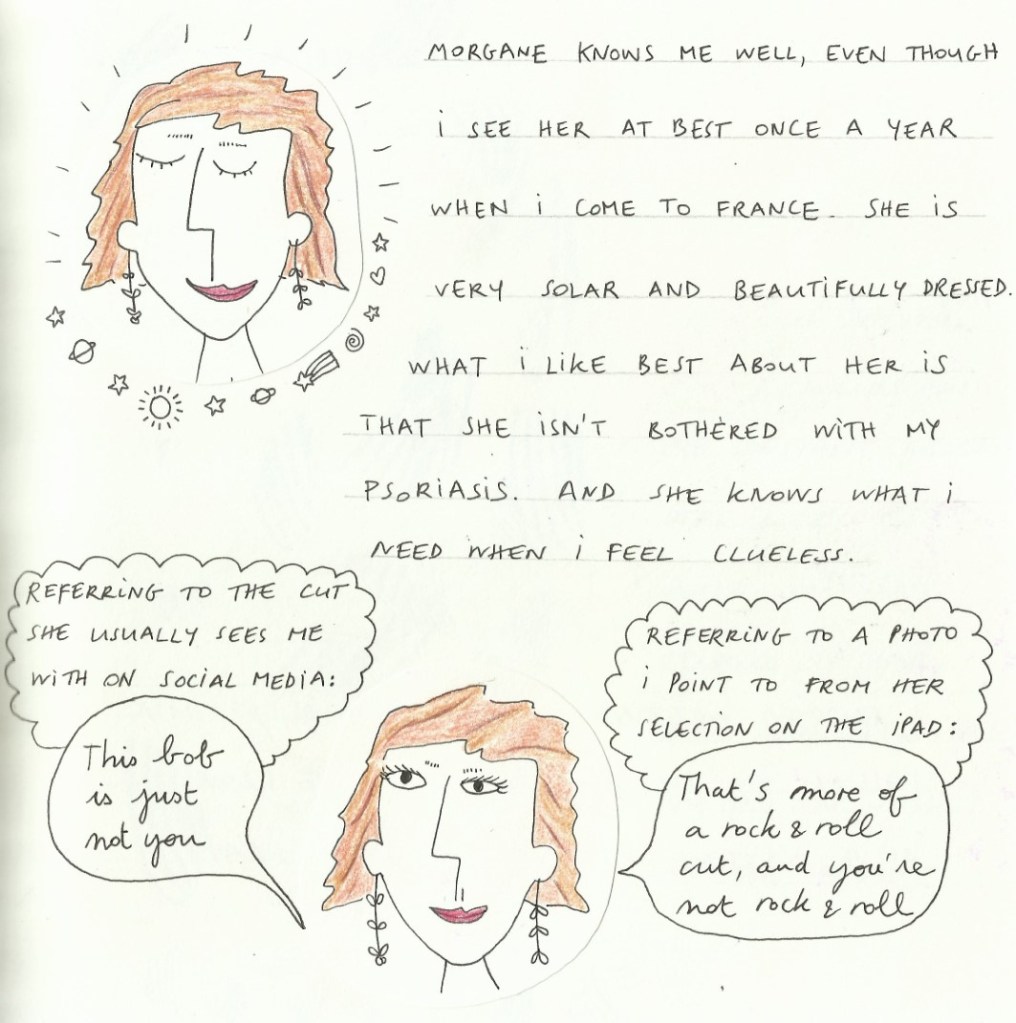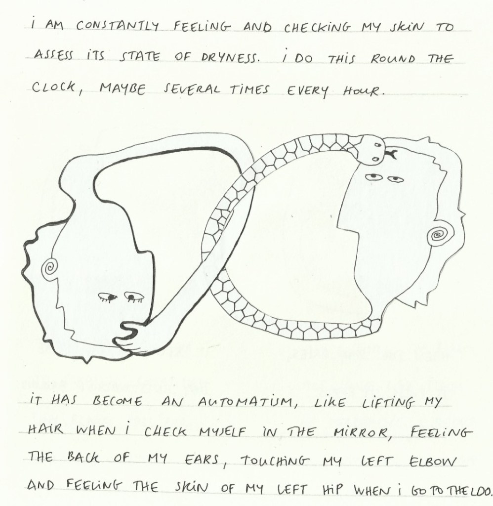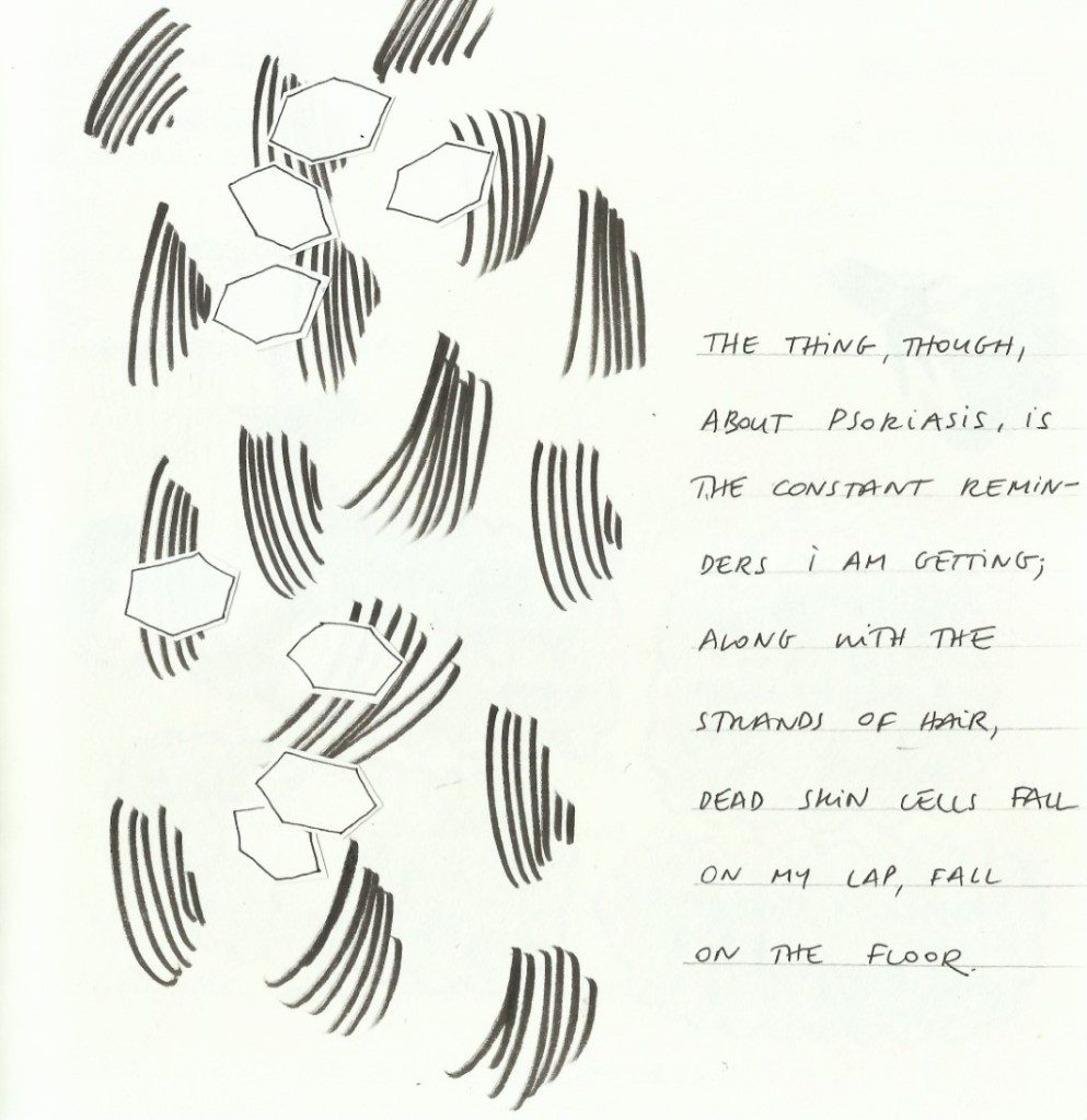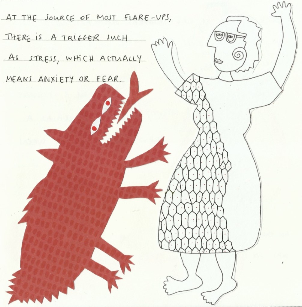 (2022) I start a graphic journal that I name Our Lady of Psoriasis, at a time of a serious flare-up after a long phase of steady improvement. This time, drawing did not seem to have an incidence on reducing the inflammation, however it was more bearable to live through it as I drew. The first pages address the feelings of psoriasis skin and the attempts to heal.