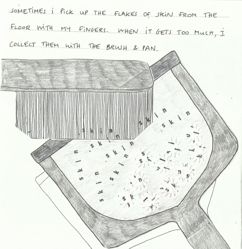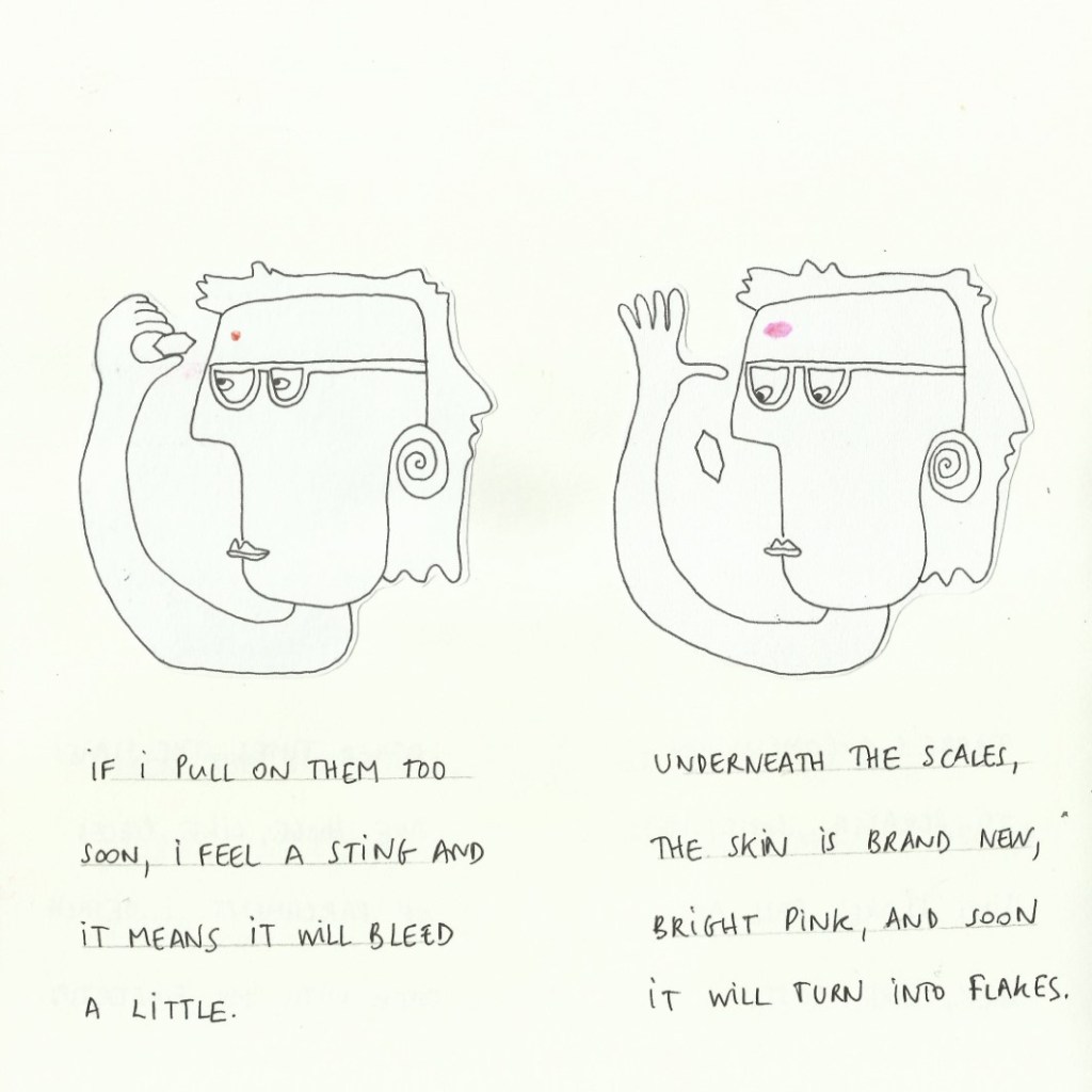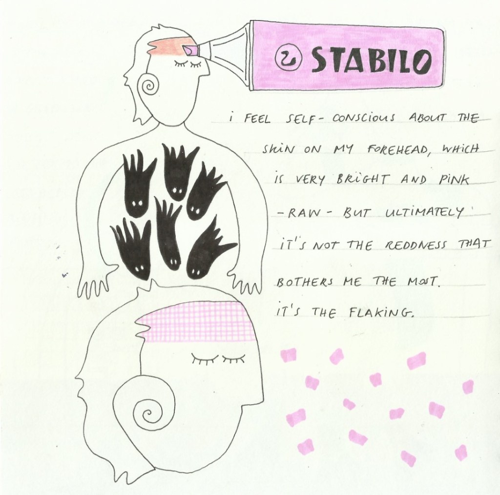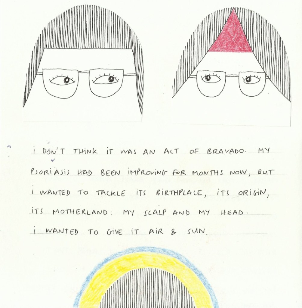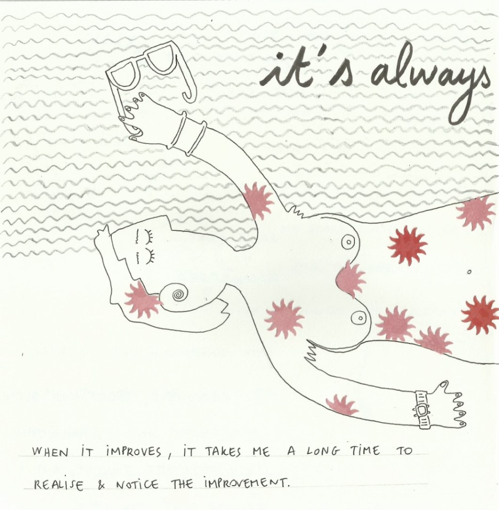 (2022) I start a graphic journal that I name Our Lady of Psoriasis, at a time of a serious flare-up after a long phase of steady improvement. This time, drawing did not seem to have an incidence on reducing the inflammation, however it was more bearable to live through it as I drew. The first pages address the feelings of psoriasis skin and the attempts to heal.