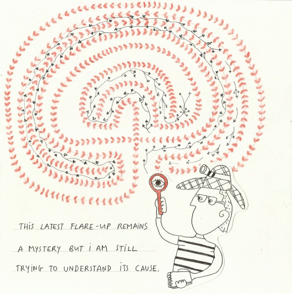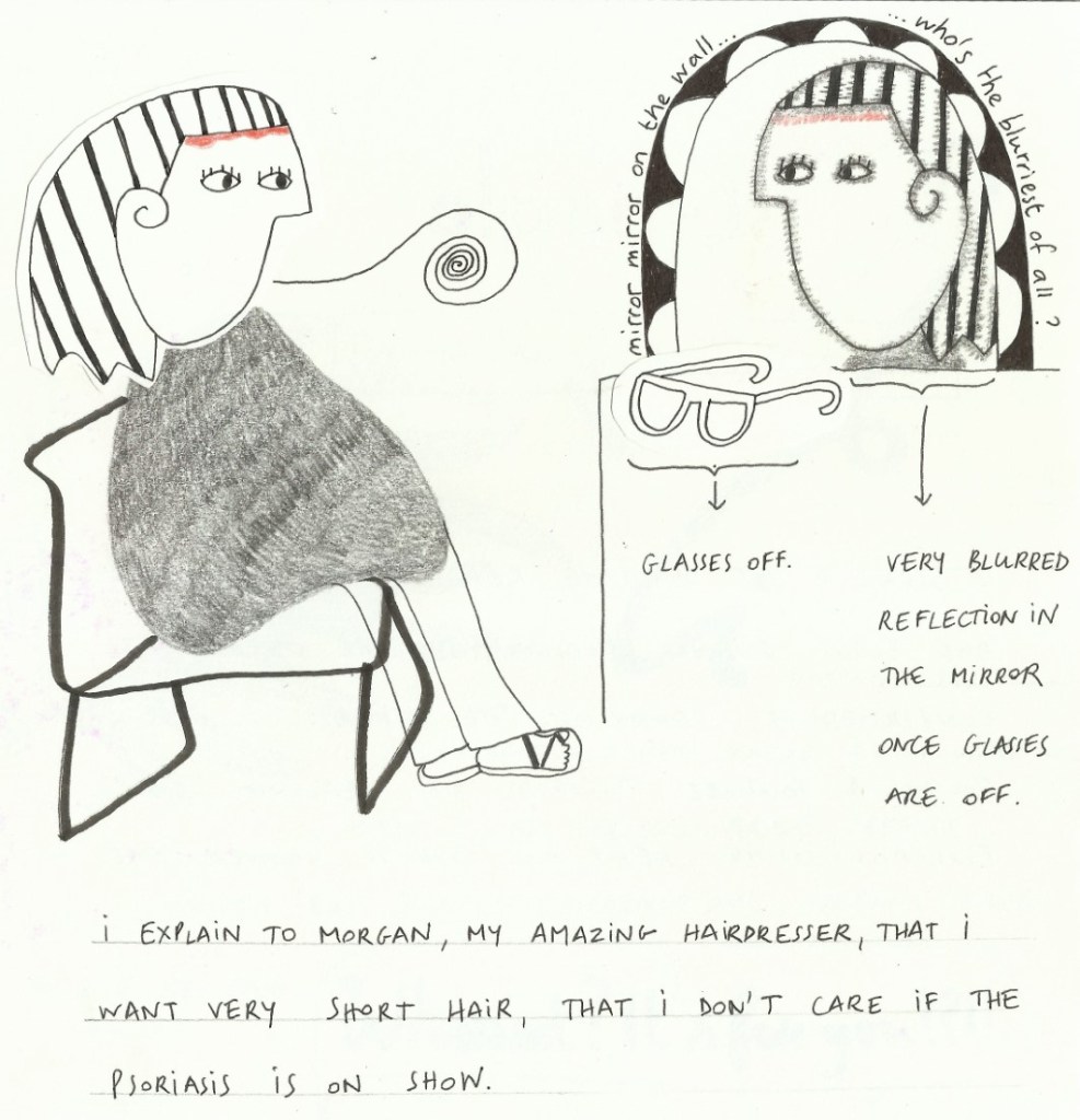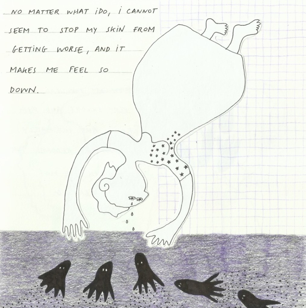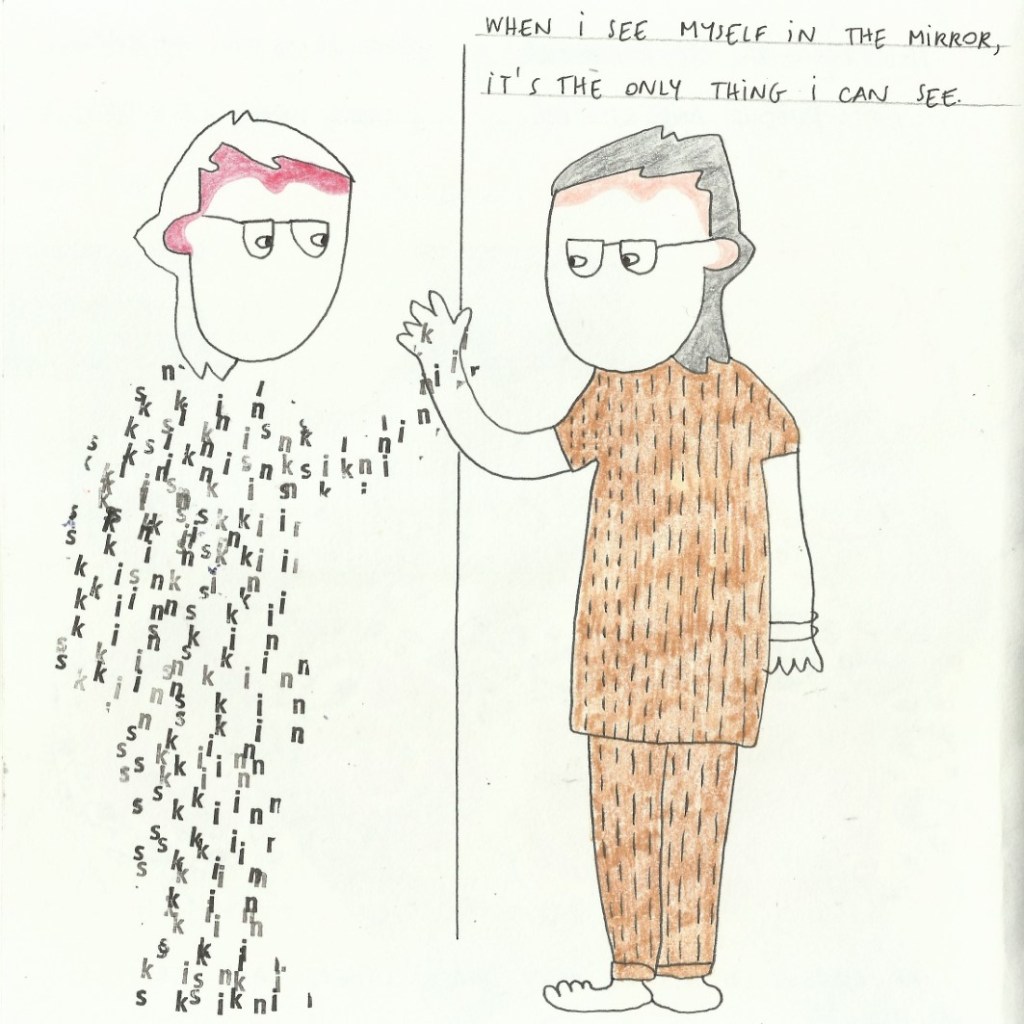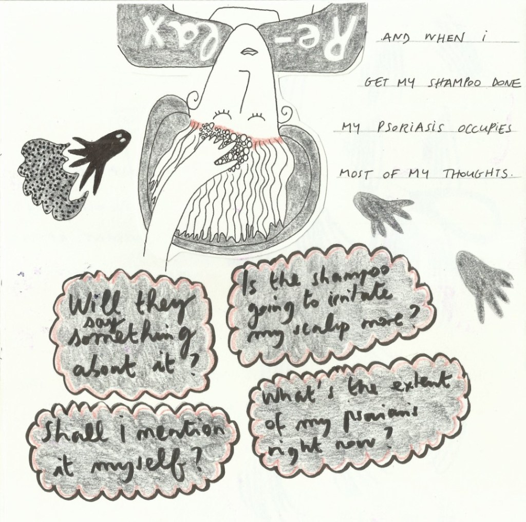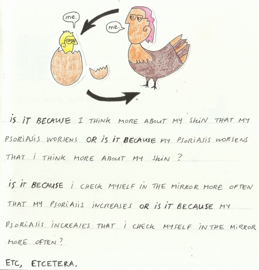 (2022) I start a graphic journal that I name Our Lady of Psoriasis, at a time of a serious flare-up after a long phase of steady improvement. This time, drawing did not seem to have an incidence on reducing the inflammation, however it was more bearable to live through it as I drew. The first pages address the feelings of psoriasis skin and the attempts to heal.