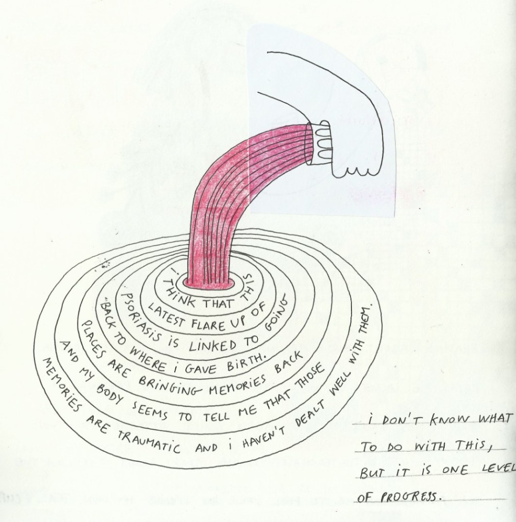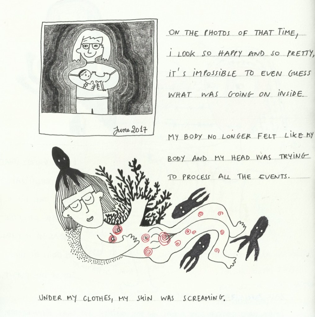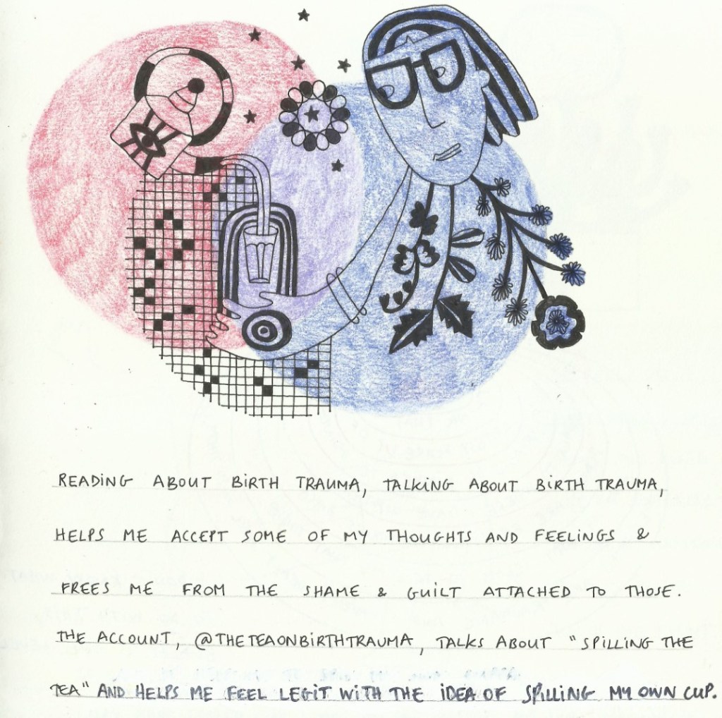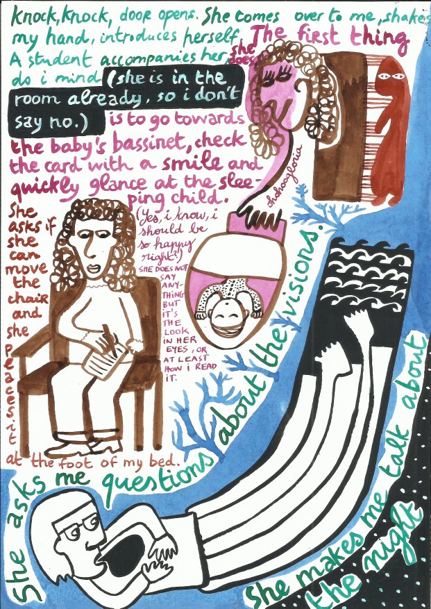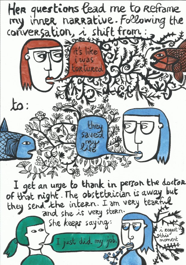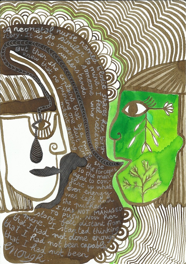 Since birth trauma happened, I have made, drawn and written about it in various places and formats, including the ceramics mural Postpartum (2018) and ink drawings in a series, still ongoing, called Post x Partum.