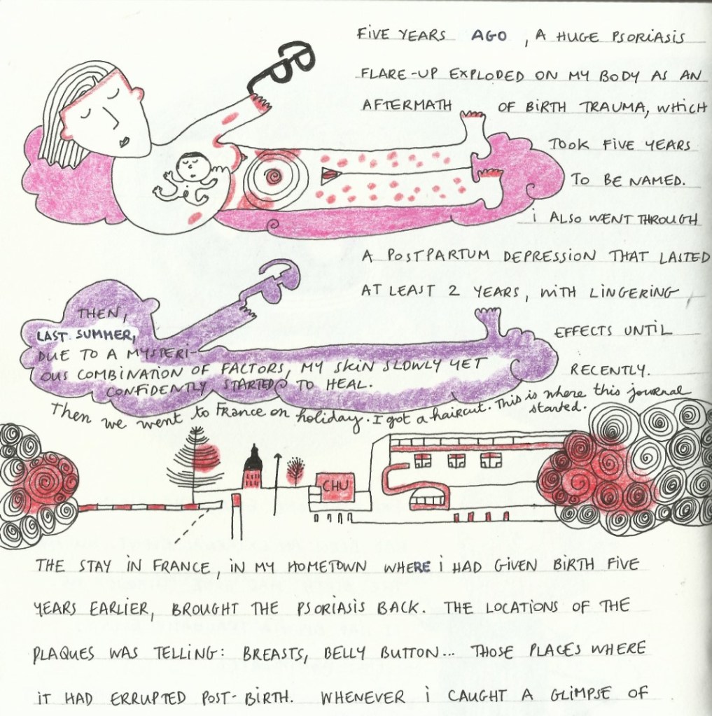 In the next section of the book Our Lady of Psoriasis, I address birth trauma, the post partum phase being a major trigger of a psoriasis flareup.